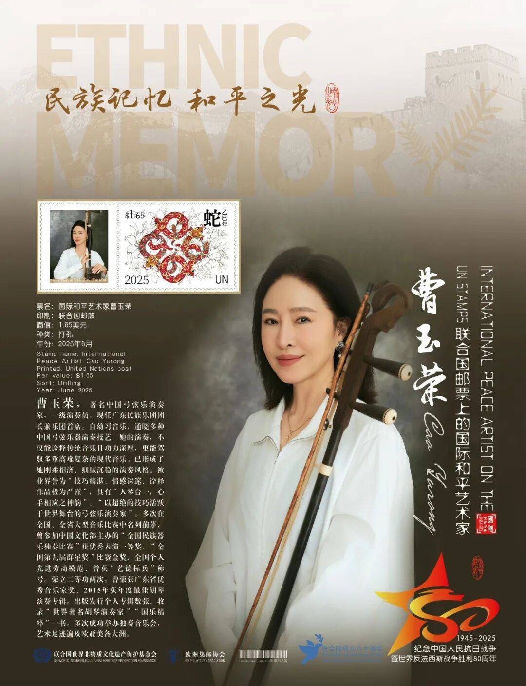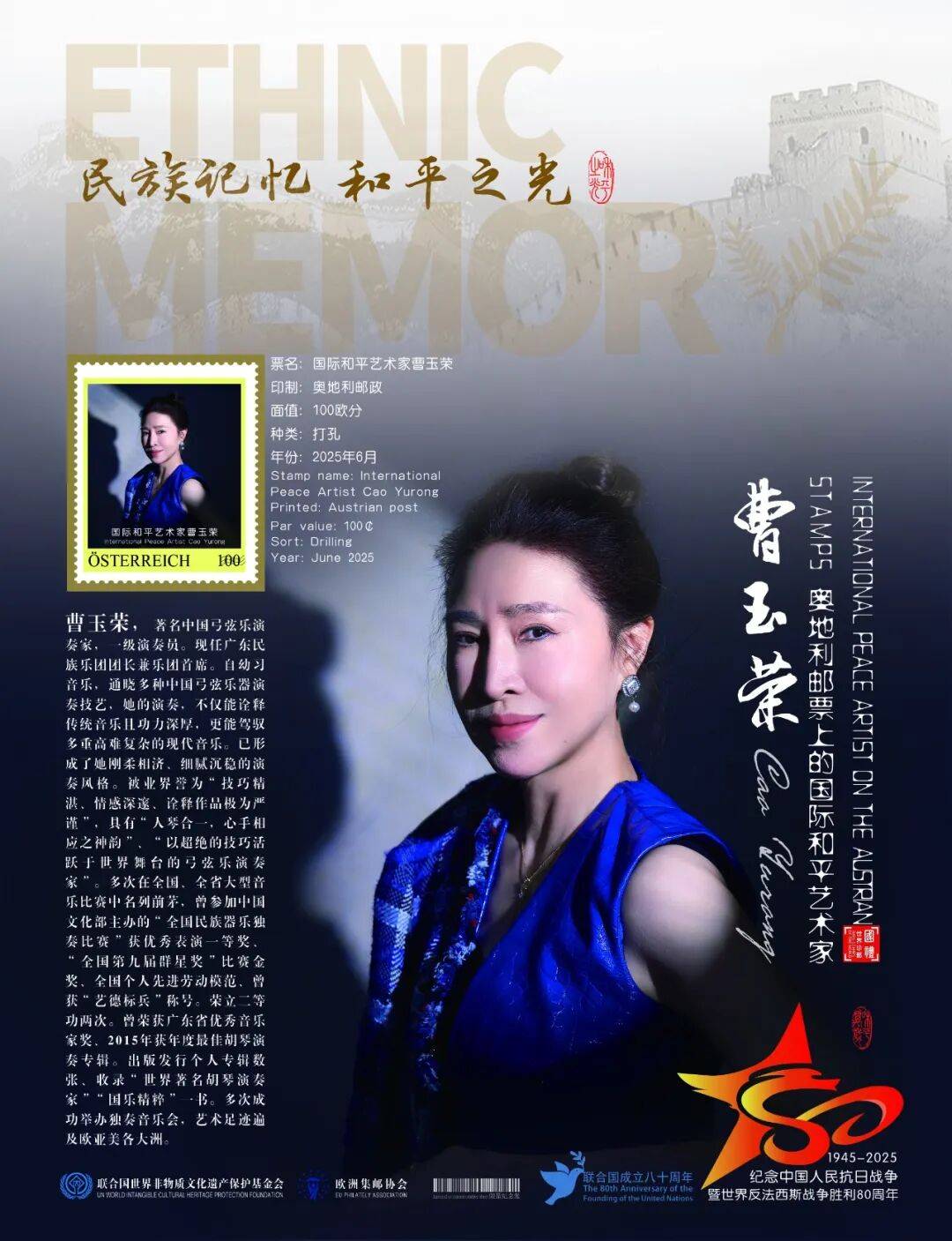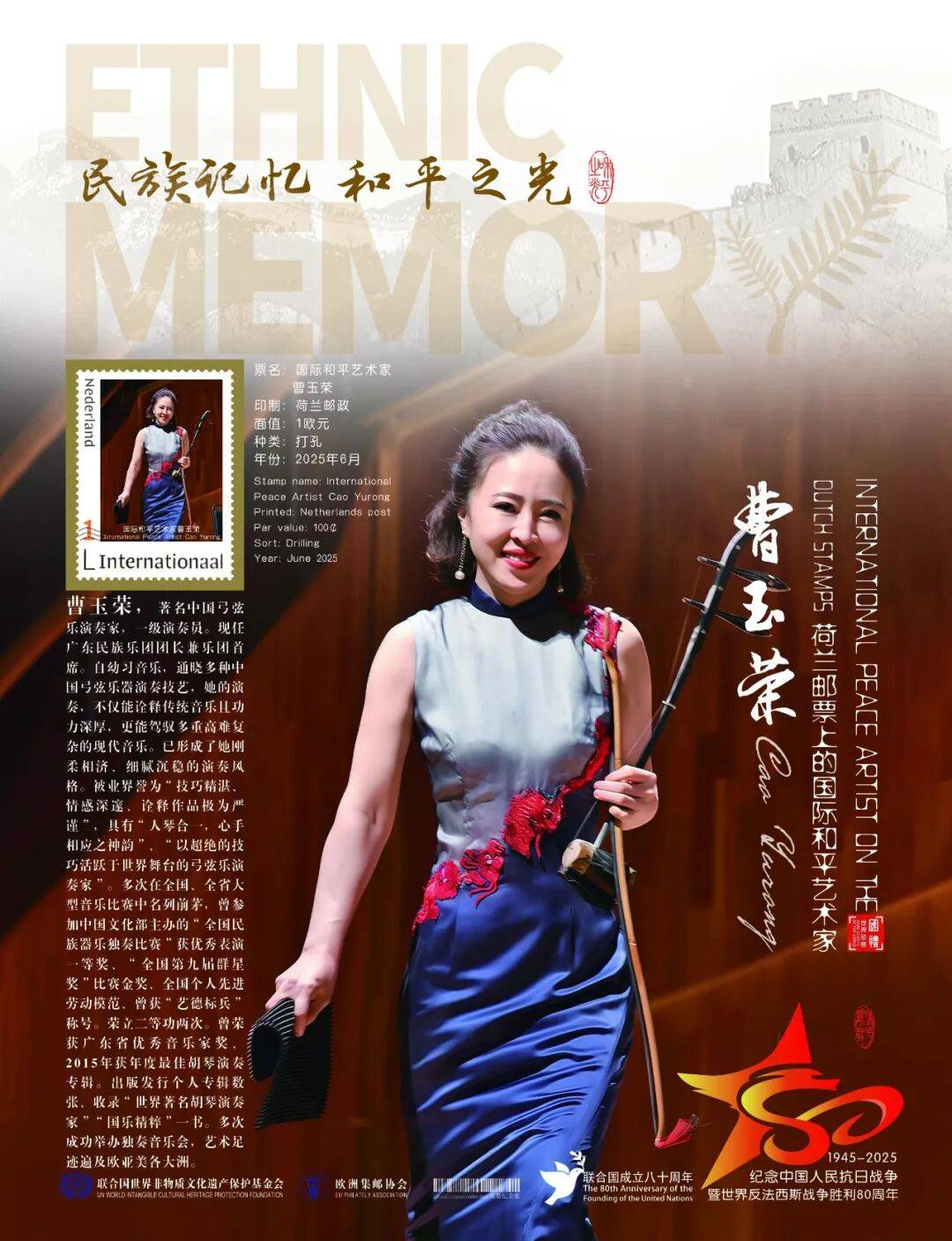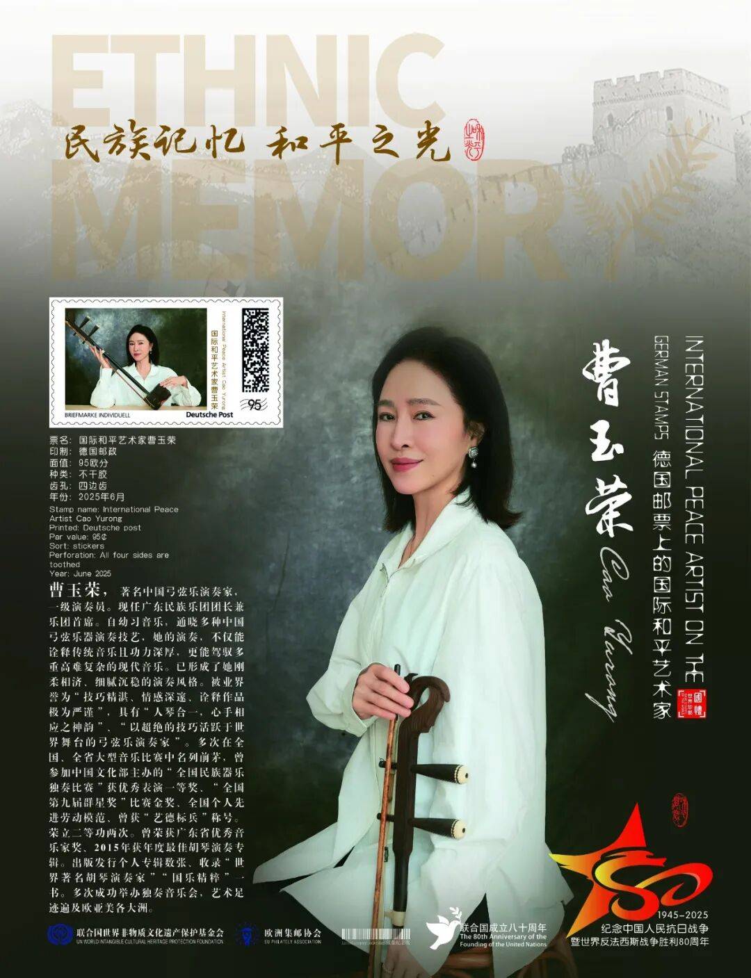 同时,联合国邮政、德国邮政、奥地利邮政、荷兰邮政为中国演奏名家曹玉荣在全球公开发行一套以纪念中国人民抗日战争暨世界反法西斯战争胜利80周年“民族记忆 和平之光——国际和平艺术家”为主题的邮票与珍藏册。以邮为媒,方寸之间让世界各地的人们感受到爱与和平的力量,并为世界和平发展注入新能量。