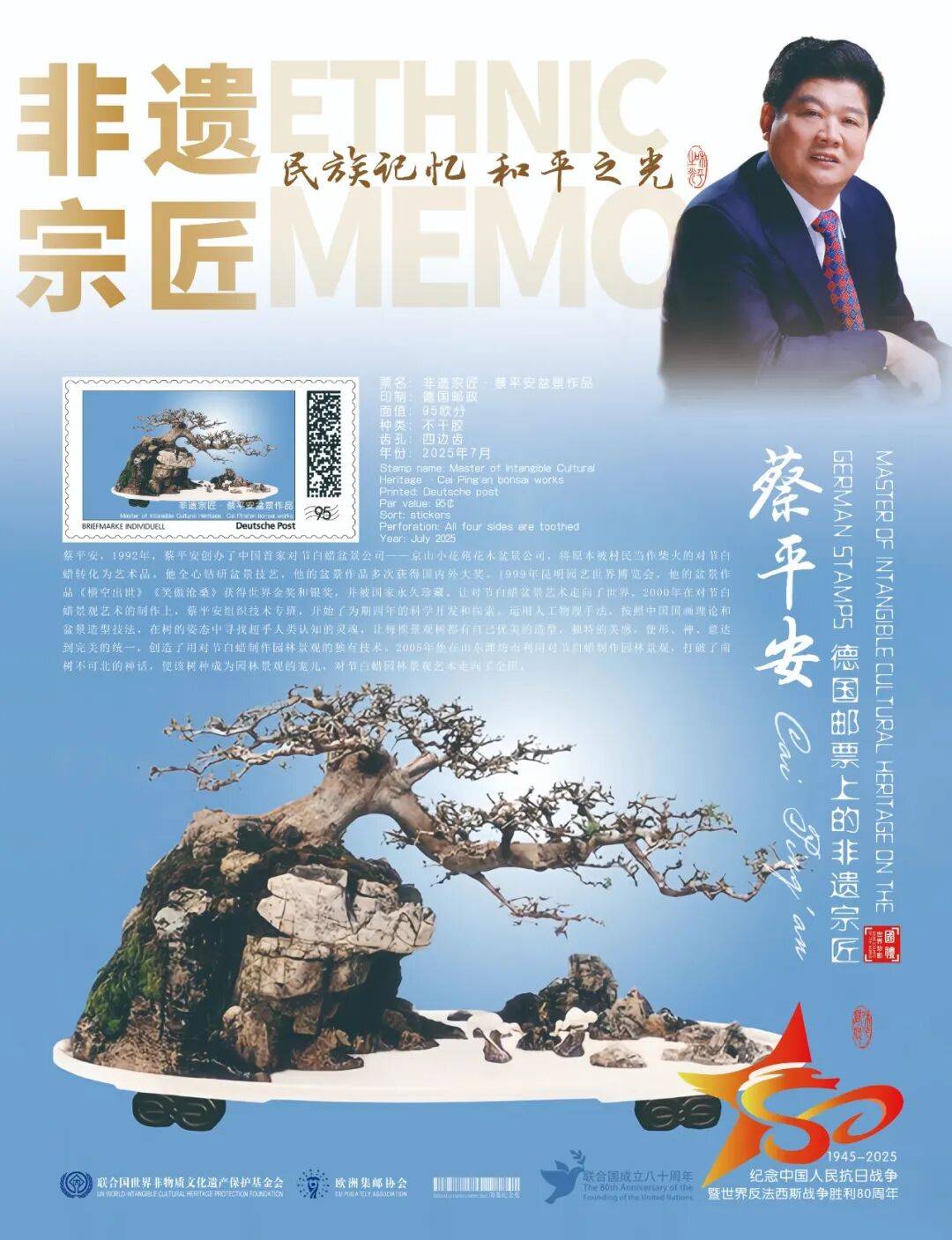 同时,联合国邮政、德国邮政、奥地利邮政、荷兰邮政为中国非遗传承人蔡平安在全球公开发行一套以纪念中国人民抗日战争暨世界反法西斯战争胜利80周年“民族记忆 和平之光——非遗宗匠”为主题的邮票与珍藏册。以邮为媒,方寸之间让世界各地的人们感受到爱与和平的力量,并为世界和平发展注入新能量。