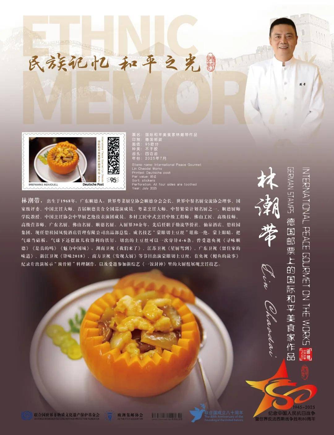 同时,联合国邮政、德国邮政、荷兰邮政、奥地利邮政为中国烹饪名家林潮带在全球公开发行一套以纪念中国人民抗日战争暨世界反法西斯战争胜利80周年“民族记忆 和平之光——国际和平艺术家”为主题的邮票与珍藏册。以邮为媒,方寸之间让世界各地的人们感受到爱与和平的力量,并为世界和平发展注入新能量。