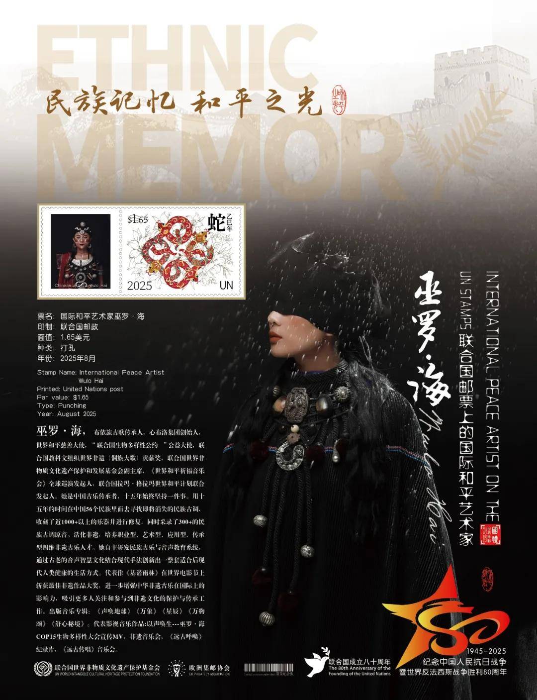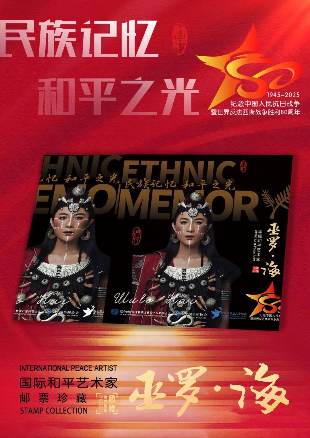 同时,联合国邮政、法国邮政、德国邮政、荷兰邮政为中国非遗古乐名家巫罗·海在全球公开发行一套以纪念中国人民抗日战争暨世界反法西斯战争胜利80周年“民族记忆 和平之光——国际和平艺术家”为主题的邮票与珍藏册。以邮为媒,方寸之间让世界各地的人们感受到爱与和平的力量,并为世界和平发展注入新能量。