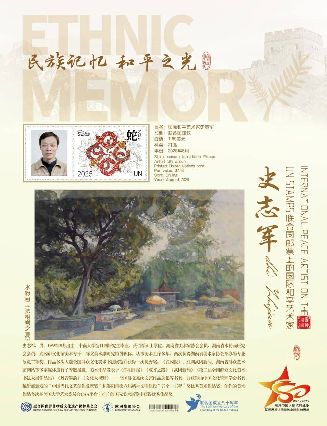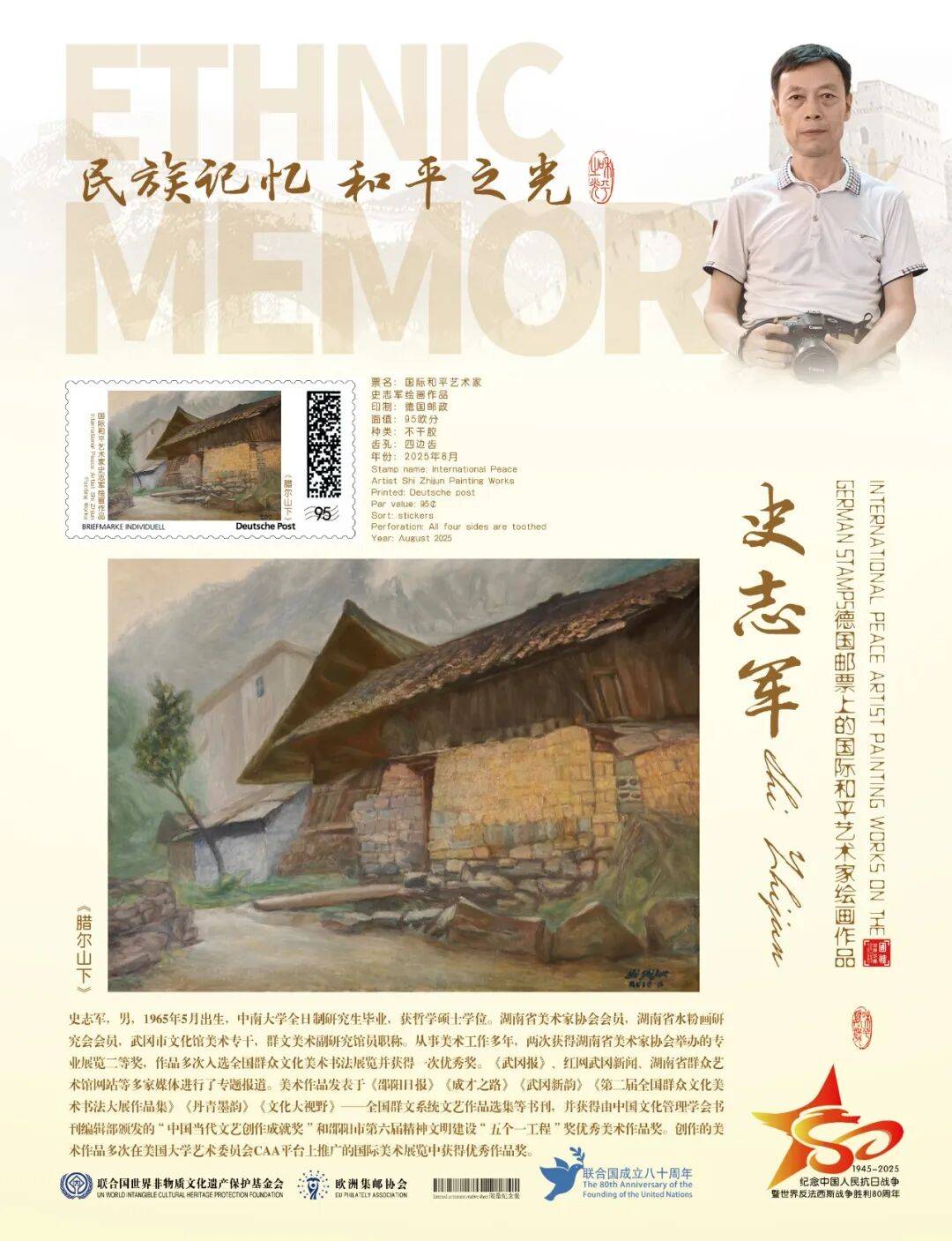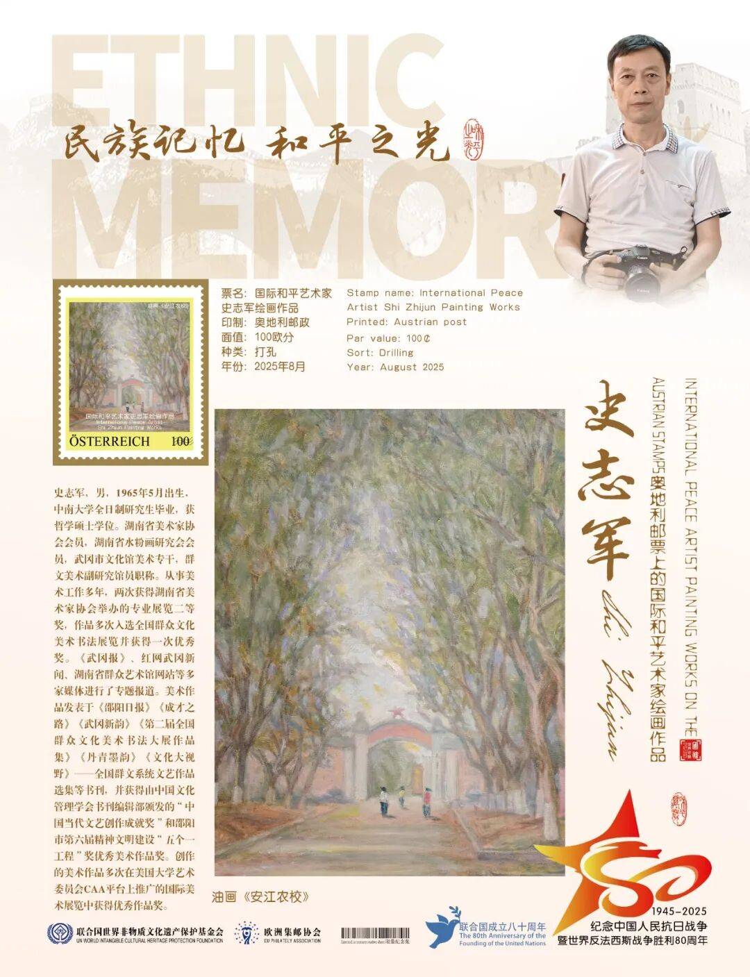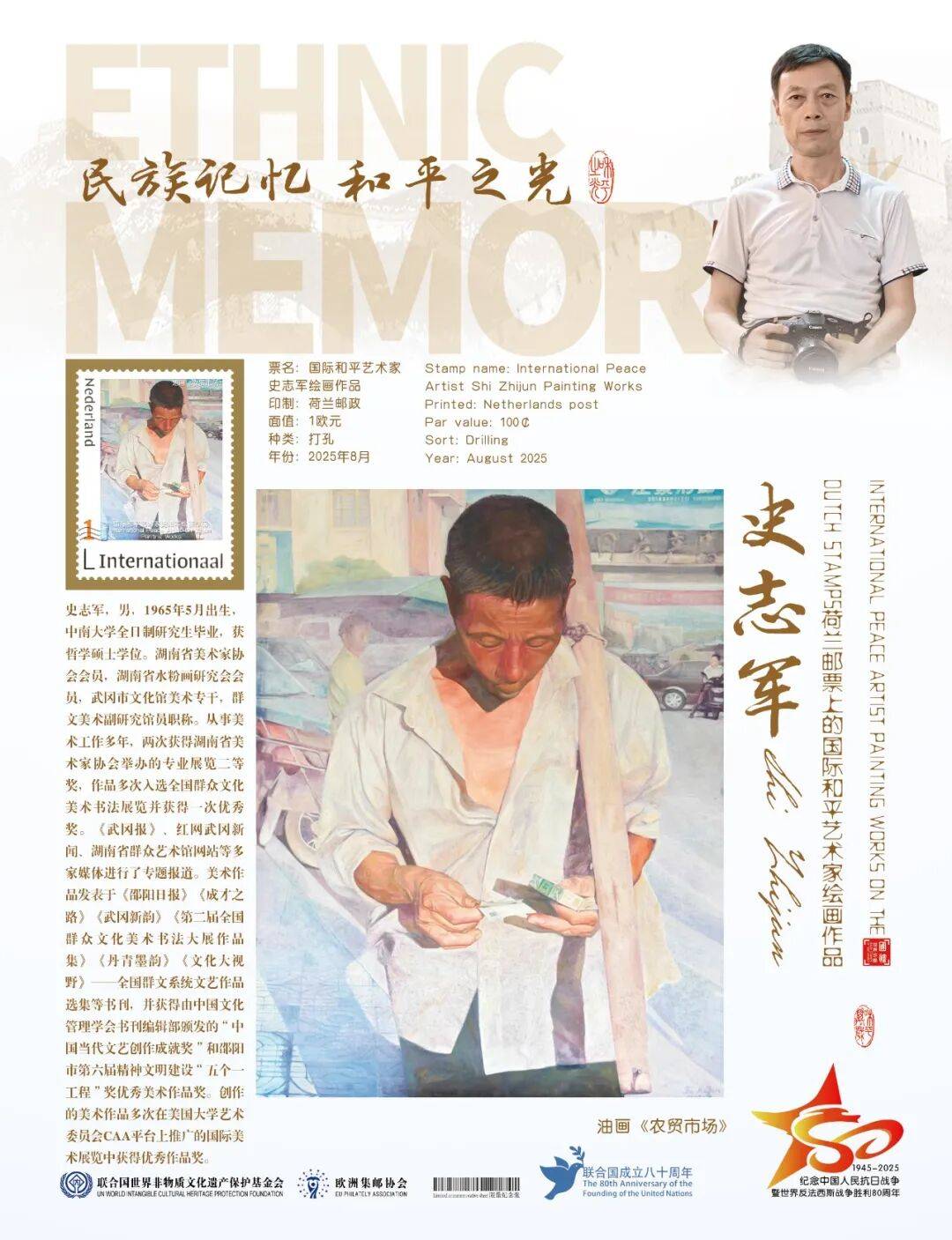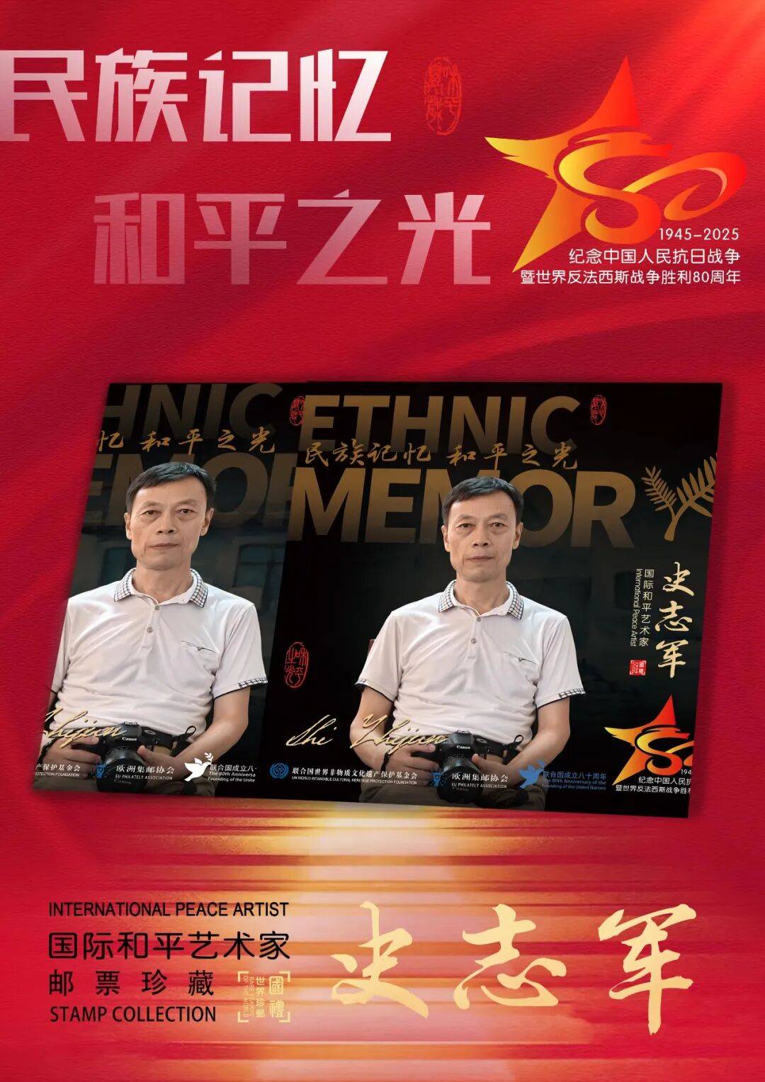 同时,联合国邮政、德国邮政、奥地利邮政、荷兰邮政为中国绘画名家史志军在全球公开发行一套以纪念中国人民抗日战争暨世界反法西斯战争胜利80周年“民族记忆 和平之光——国际和平艺术家”为主题的邮票与珍藏册。以邮为媒,方寸之间让世界各地的人们感受到爱与和平的力量,并为世界和平发展注入新能量。