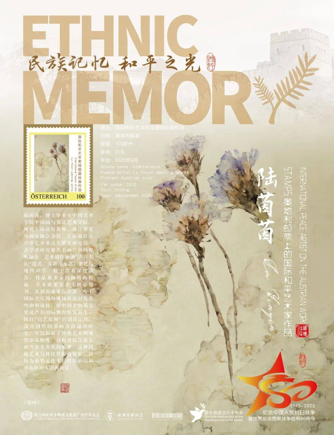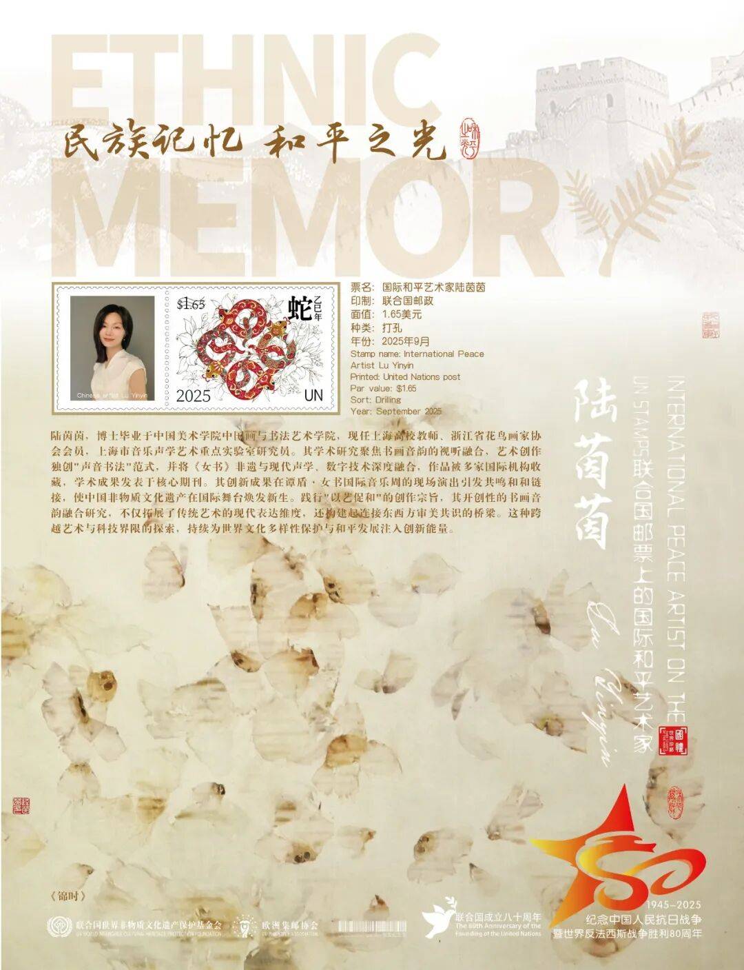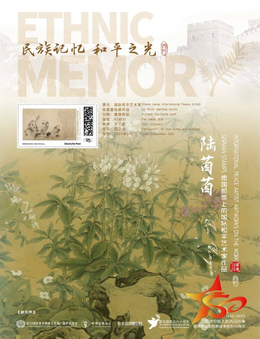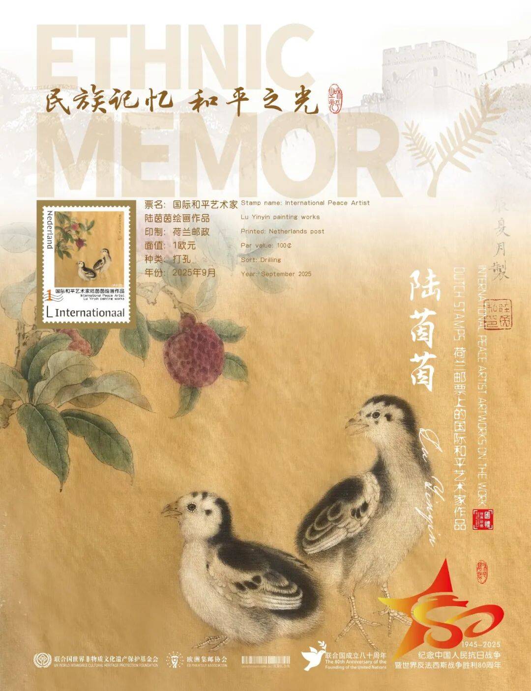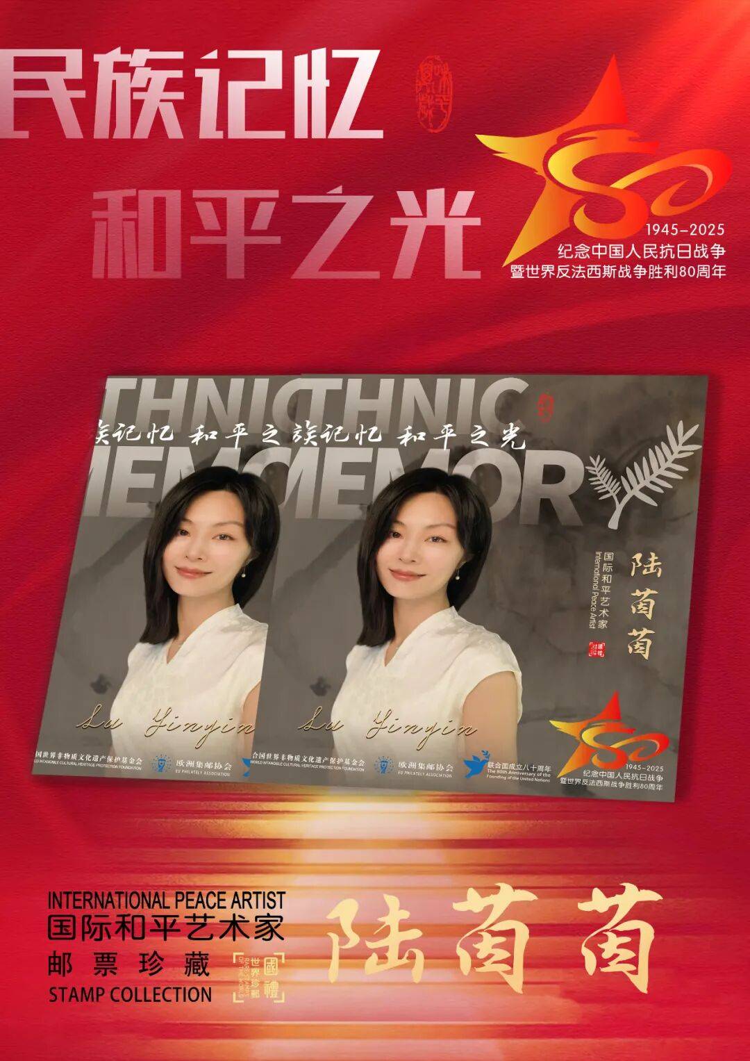 同时,联合国邮政、德国邮政、奥地利邮政、荷兰邮政为中国书画名家陆茵茵在全球公开发行一套以纪念中国人民抗日战争暨世界反法西斯战争胜利80周年“民族记忆 和平之光——国际和平艺术家”为主题的邮票与珍藏册。以邮为媒,方寸之间让世界各地的人们感受到爱与和平的力量,并为世界和平发展注入新能量。