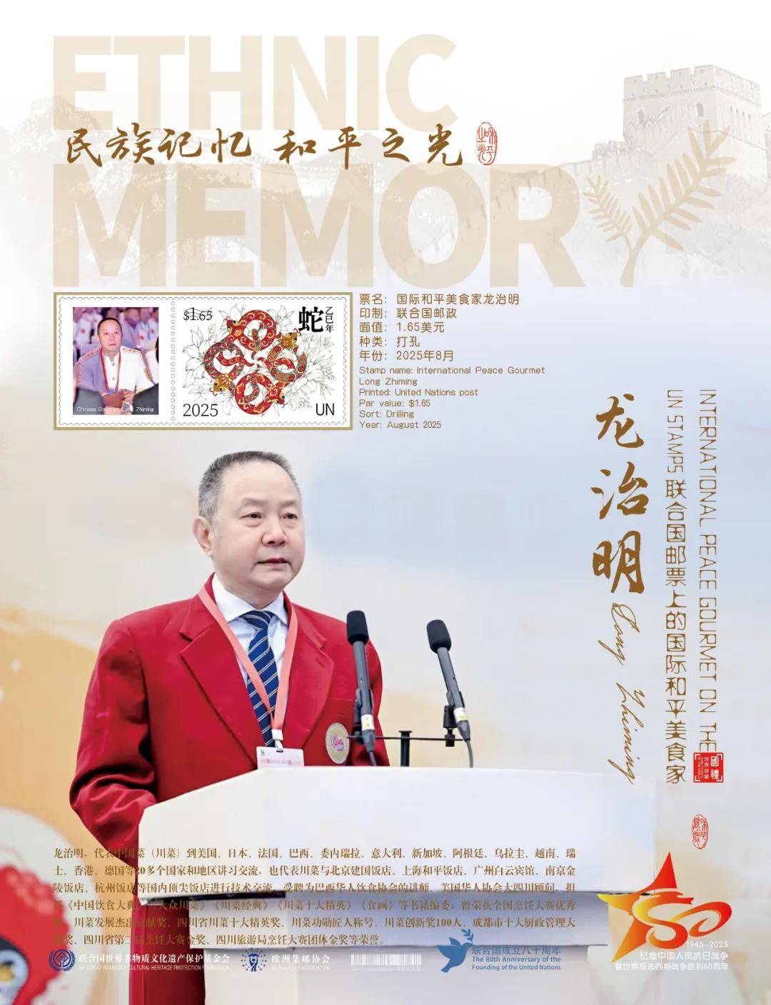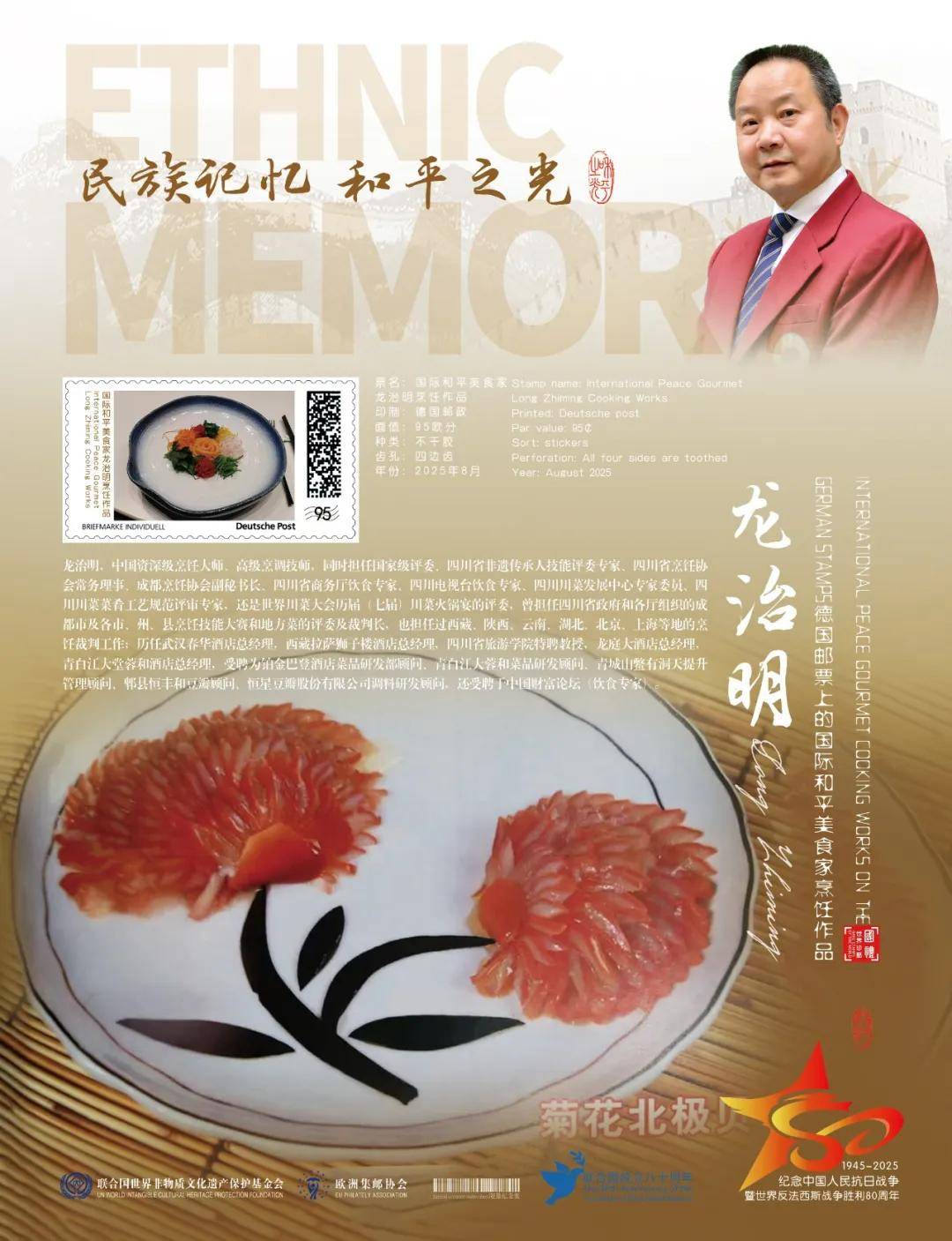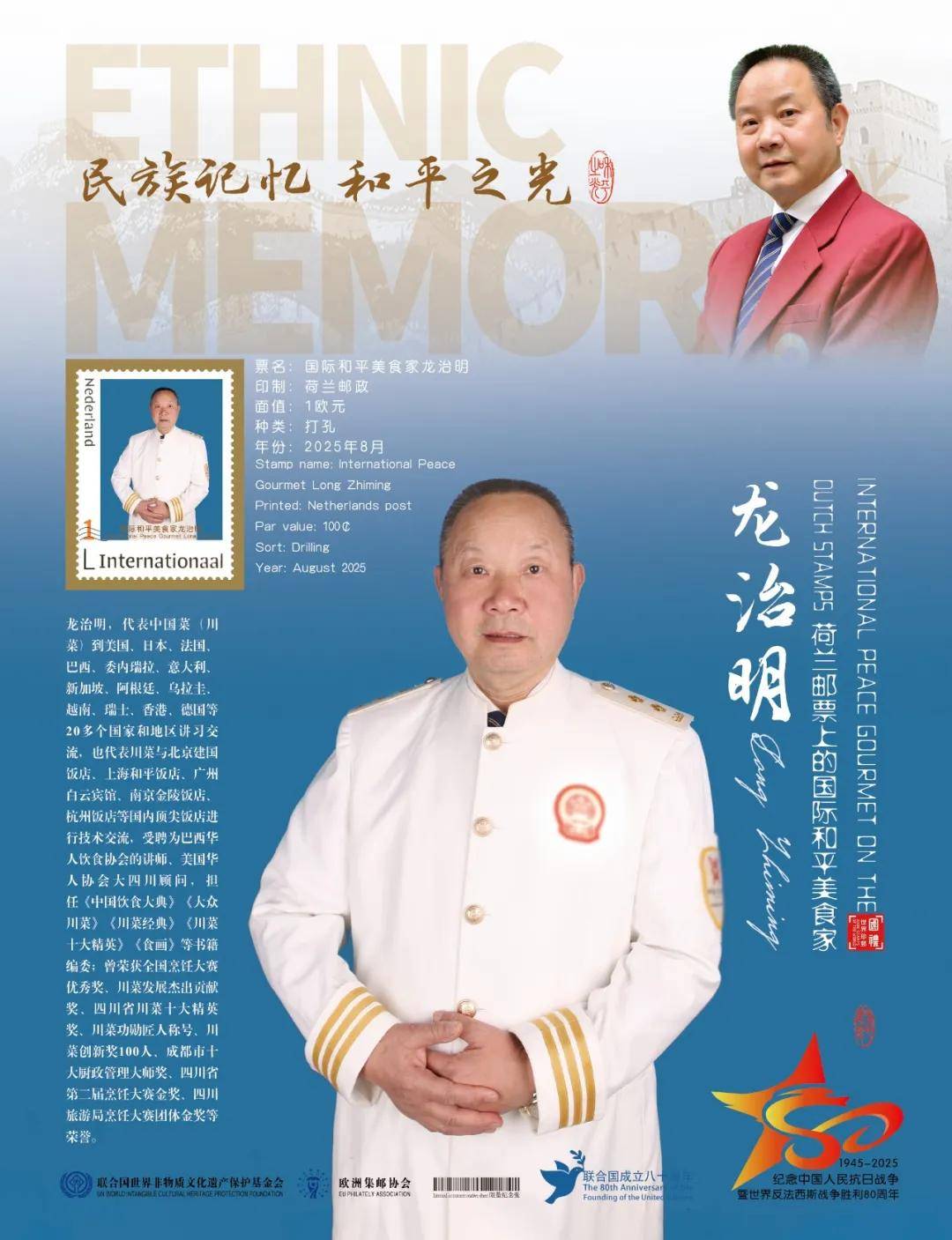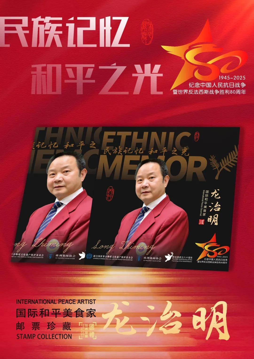 同时,联合国邮政、德国邮政、奥地利邮政、荷兰邮政为中国烹饪名家龙治明在全球公开发行一套以纪念中国人民抗日战争暨世界反法西斯战争胜利80周年“民族记忆 和平之光——国际和平美食家”为主题的邮票与珍藏册。