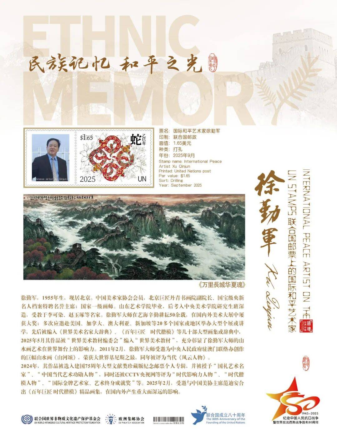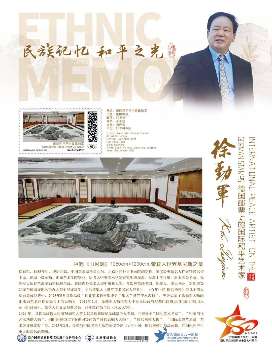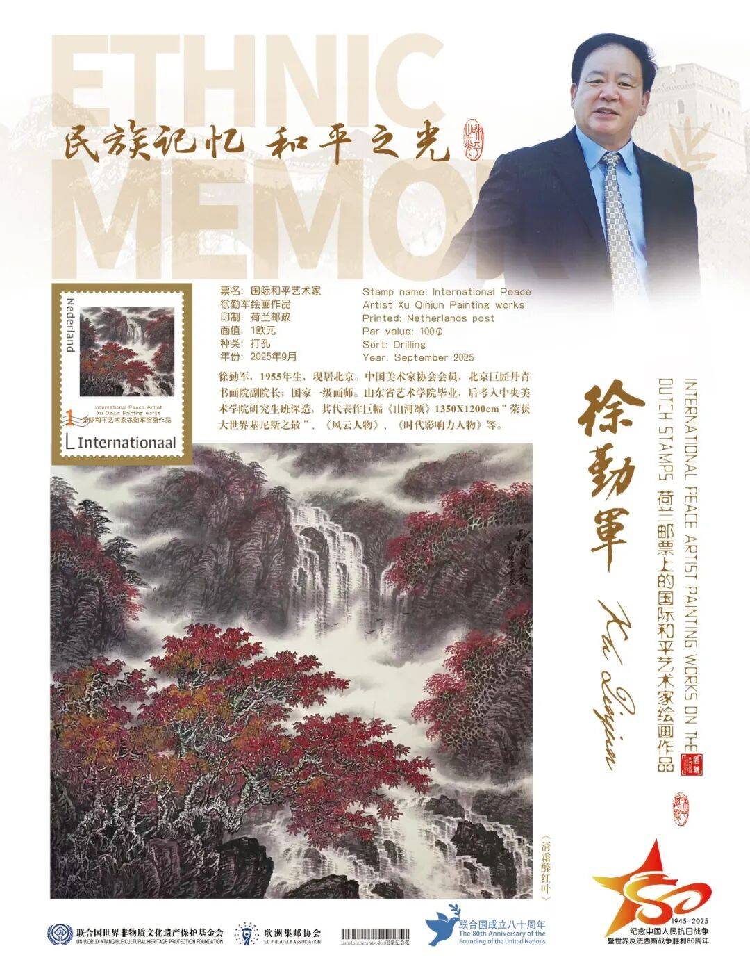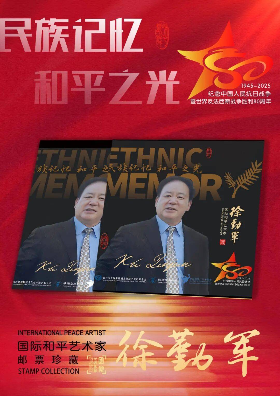 同时,联合国邮政、德国邮政、法国邮政、荷兰邮政为中国绘画名家徐勤军在全球公开发行一套以纪念中国人民抗日战争暨世界反法西斯战争胜利80周年“民族记忆 和平之光——国际和平艺术家”为主题的邮票与珍藏册。以邮为媒,方寸之间让世界各地的人们感受到爱与和平的力量,并为世界和平发展注入新能量。