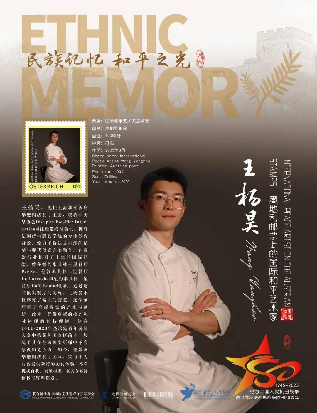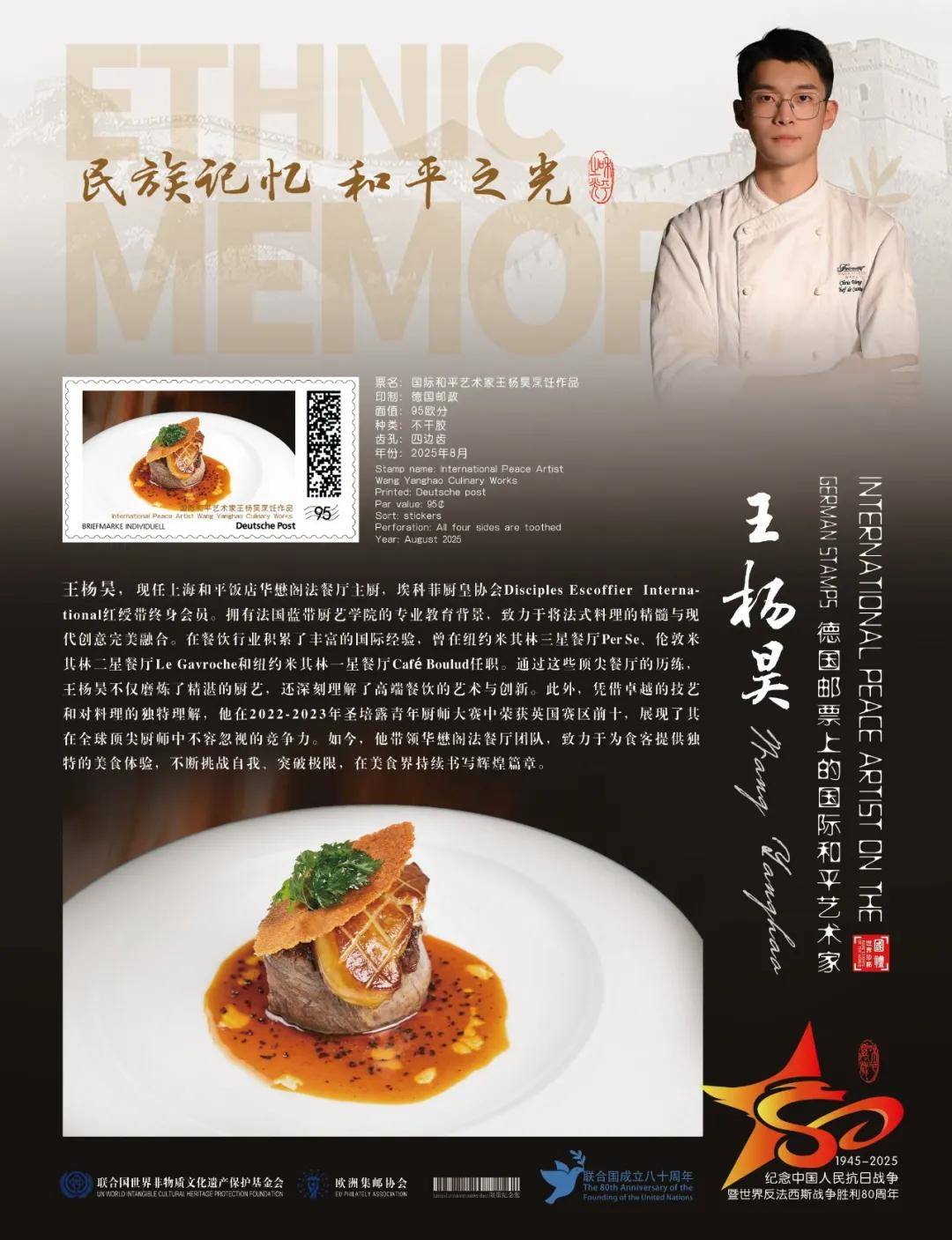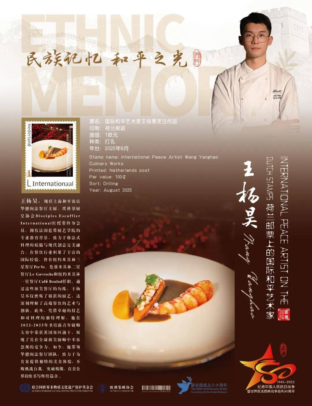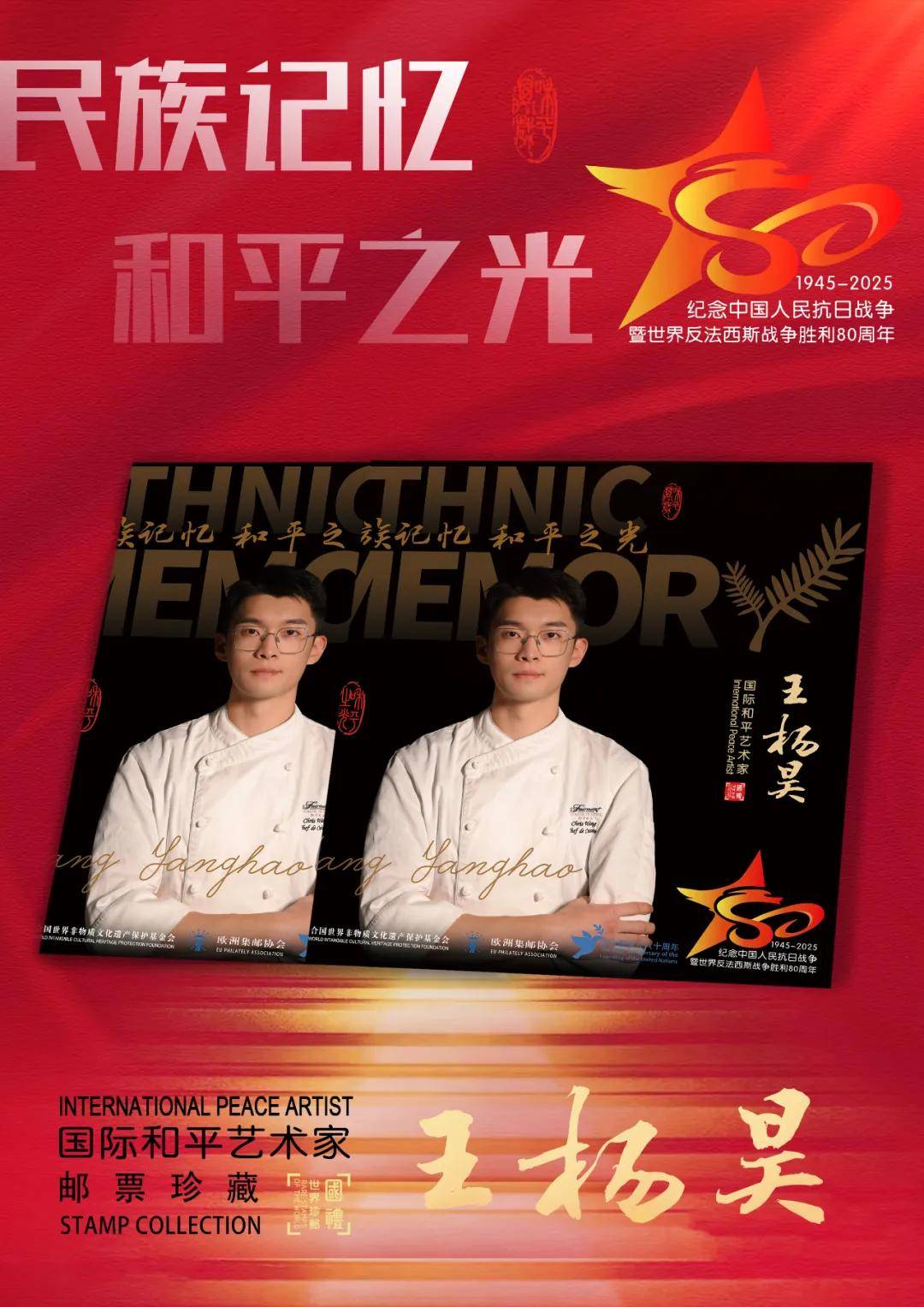同时,联合国邮政、德国邮政、荷兰邮政、奥地利邮政为中国烹饪名家王杨昊在全球公开发行一套以纪念中国人民抗日战争暨世界反法西斯战争胜利80周年“民族记忆 和平之光——国际和平艺术家”为主题的邮票与珍藏册。以邮为媒,方寸之间让世界各地的人们感受到爱与和平的力量,并为世界和平发展注入新能量。