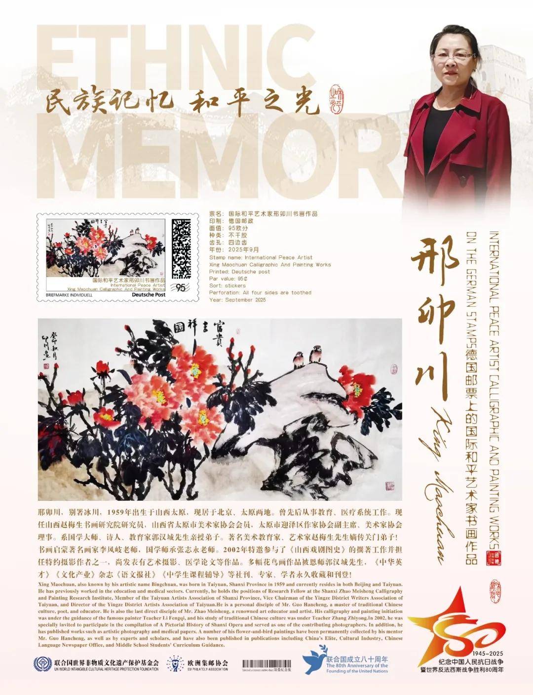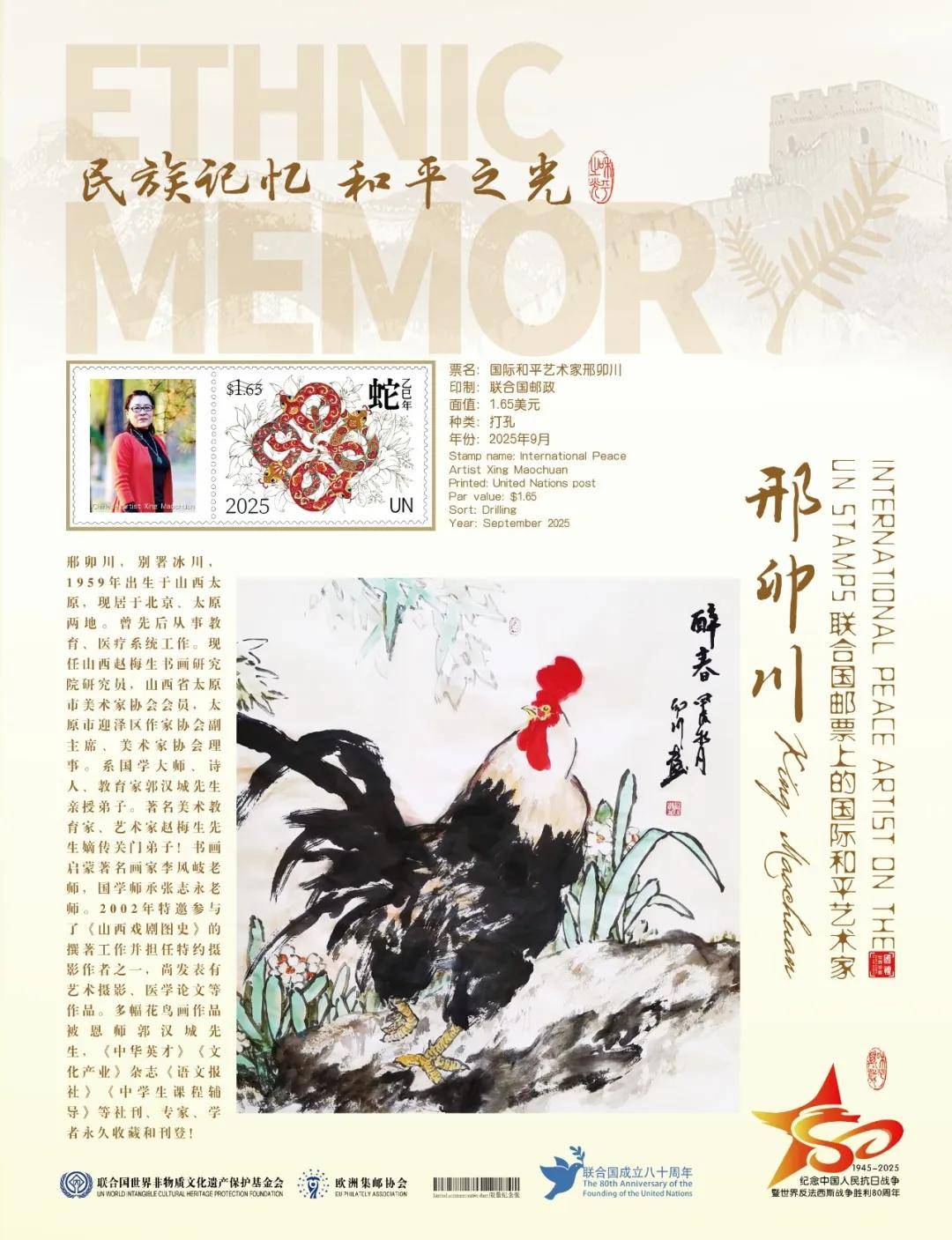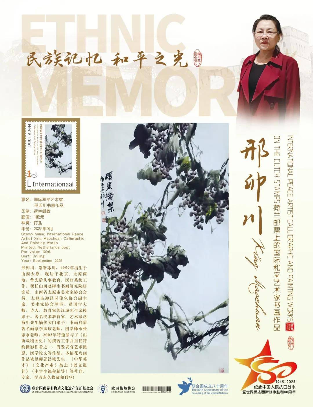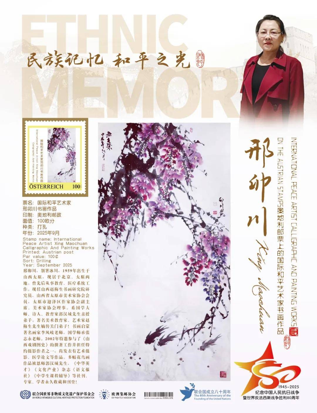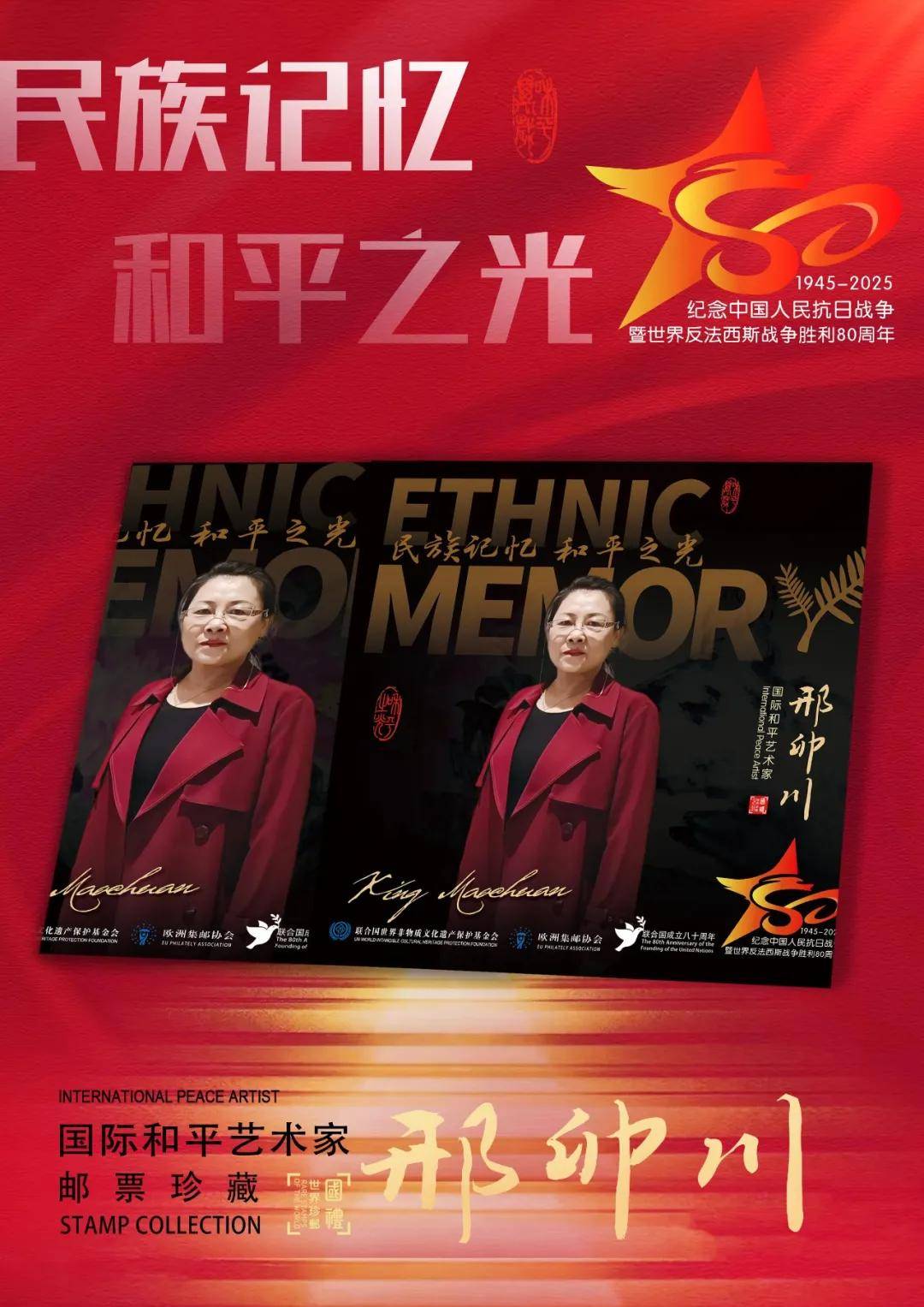 同时,联合国邮政、德国邮政、奥地利邮政、荷兰邮政为中国书画名家邢卯川在全球公开发行一套以纪念中国人民抗日战争暨世界反法西斯战争胜利80周年“民族记忆 和平之光——国际和平艺术家”为主题的邮票与珍藏册。以邮为媒,方寸之间让世界各地的人们感受到爱与和平的力量,并为世界和平发展注入新能量。