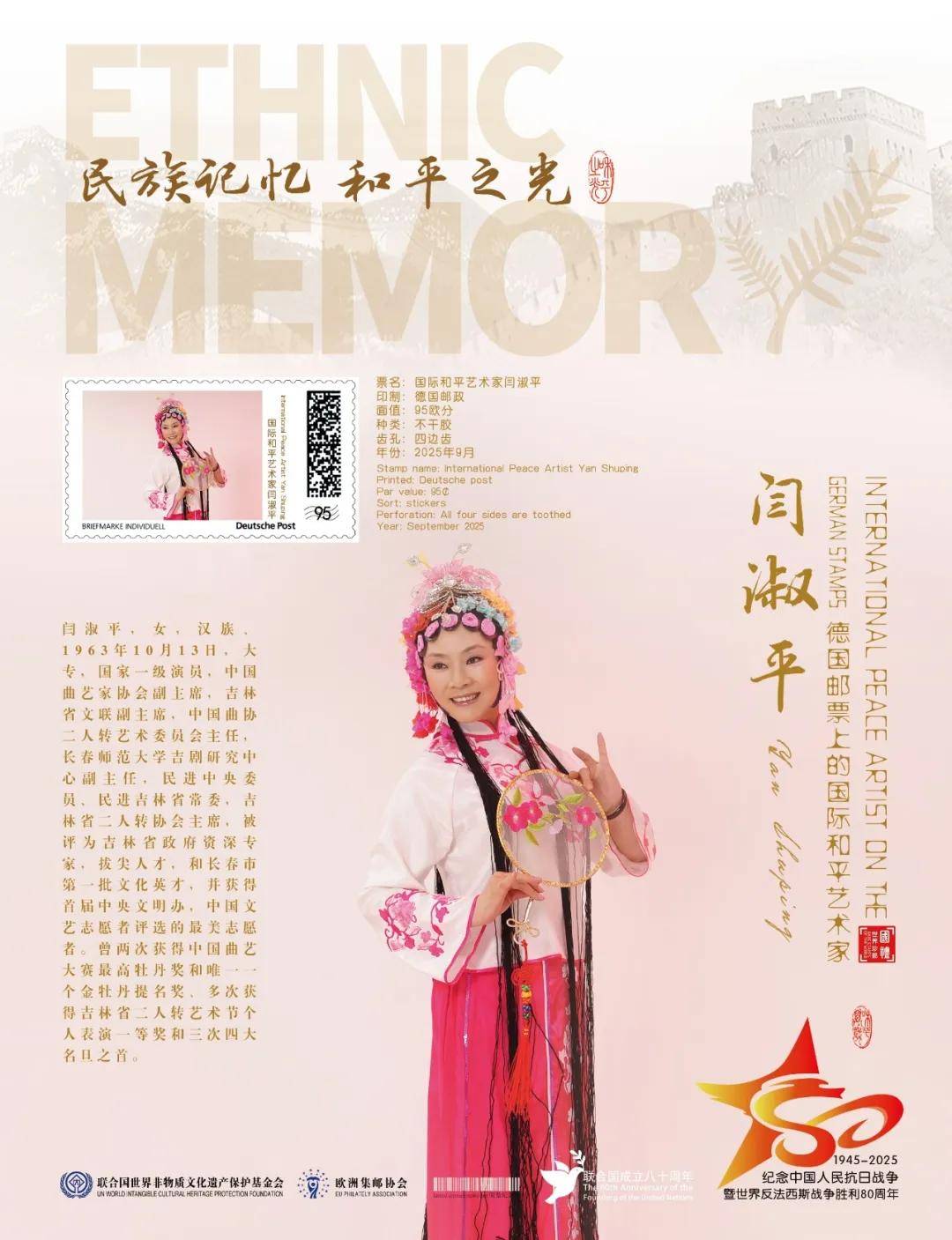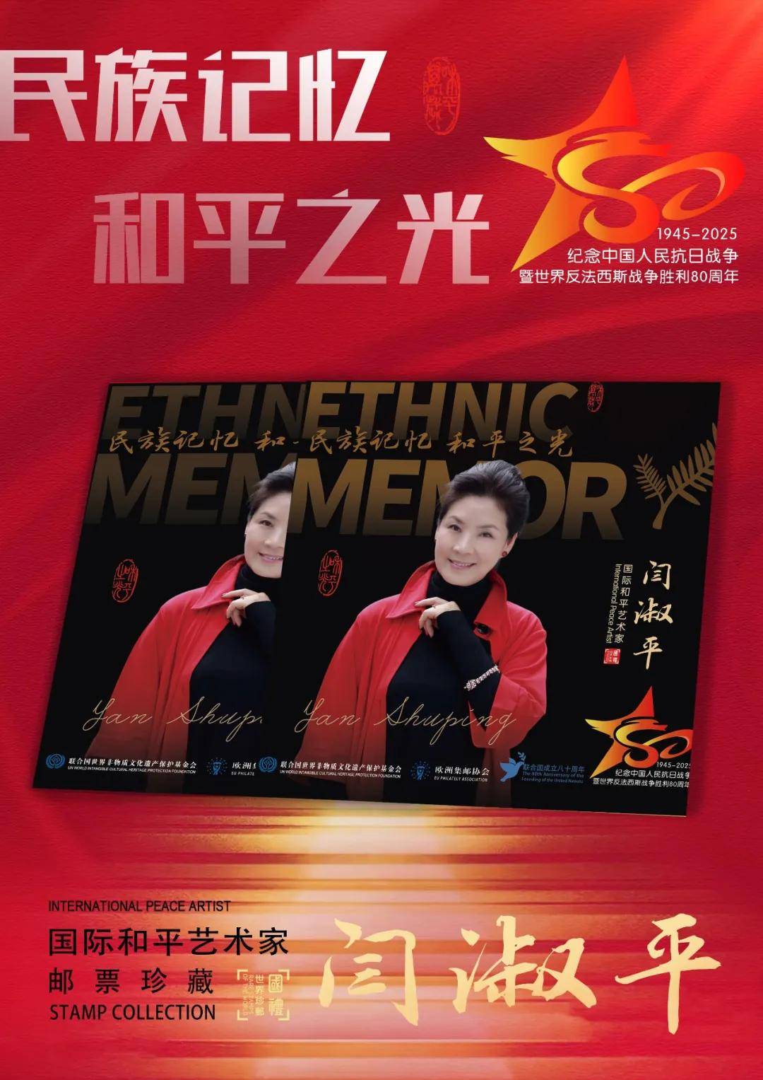 同时,联合国邮政、德国邮政、法国邮政、荷兰邮政为中国曲艺名家闫淑平在全球公开发行一套以纪念中国人民抗日战争暨世界反法西斯战争胜利80周年“民族记忆 和平之光——国际和平艺术家”为主题的邮票与珍藏册。以邮为媒,方寸之间让世界各地的人们感受到爱与和平的力量,并为世界和平发展注入新能量。