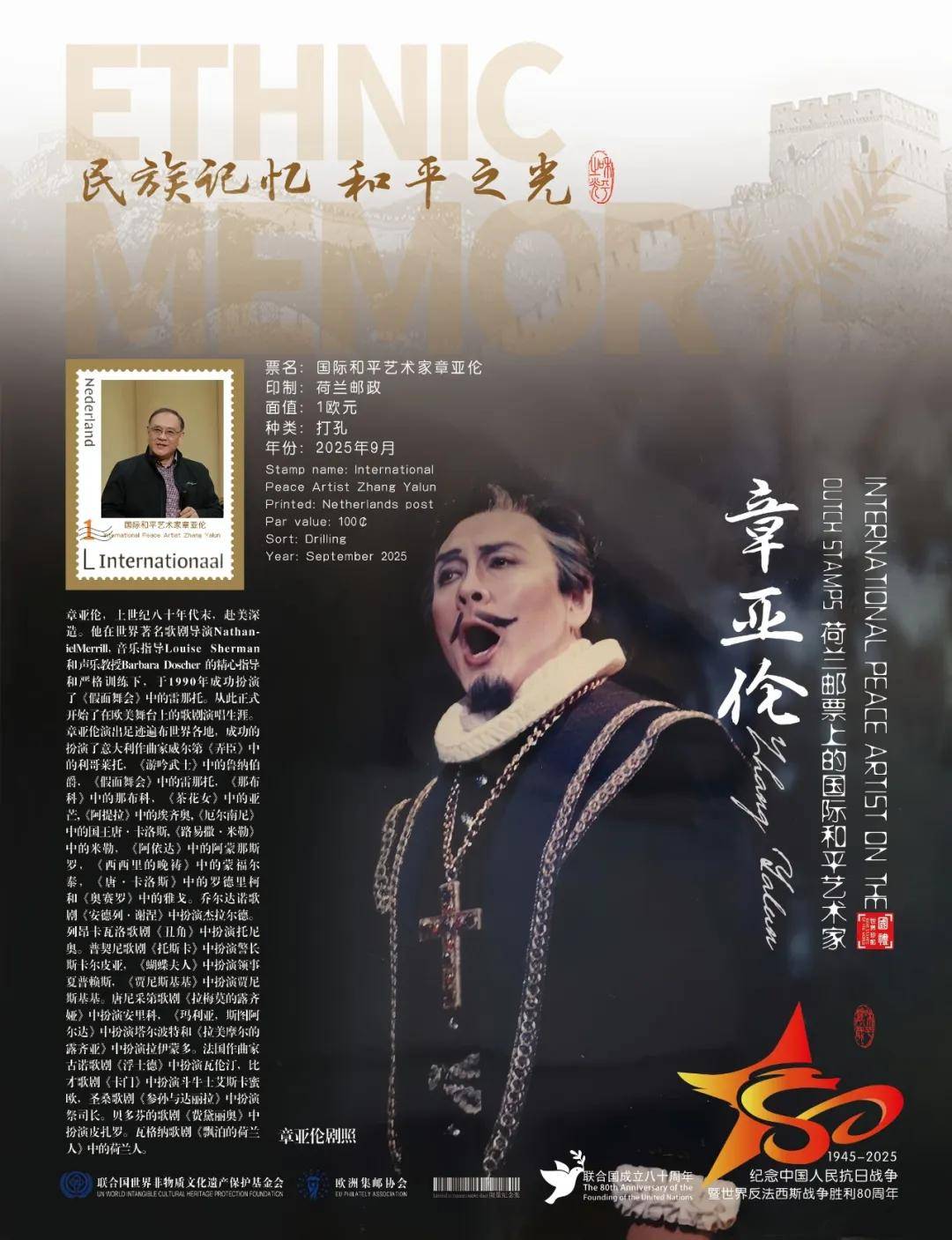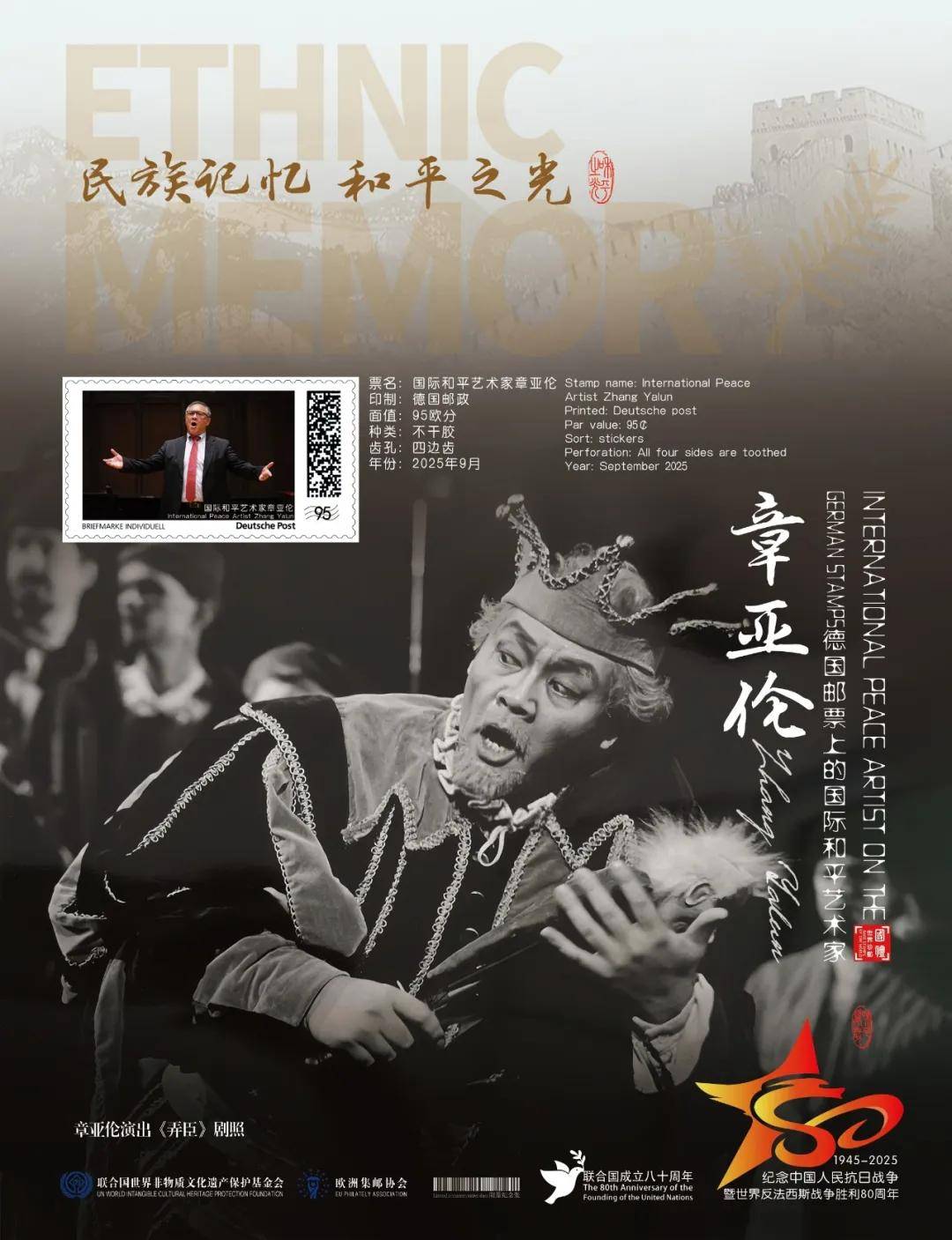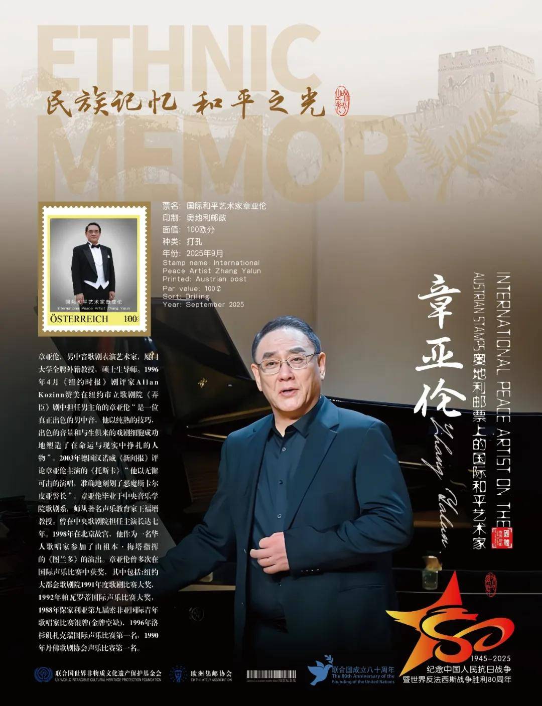 同时,联合国邮政、德国邮政、奥地利邮政、荷兰邮政为中国歌剧名家章亚伦在全球公开发行一套以纪念中国人民抗日战争暨世界反法西斯战争胜利80周年“民族记忆 和平之光——国际和平艺术家”为主题的邮票与珍藏册。以邮为媒,方寸之间让世界各地的人们感受到爱与和平的力量,并为世界和平发展注入新能量。