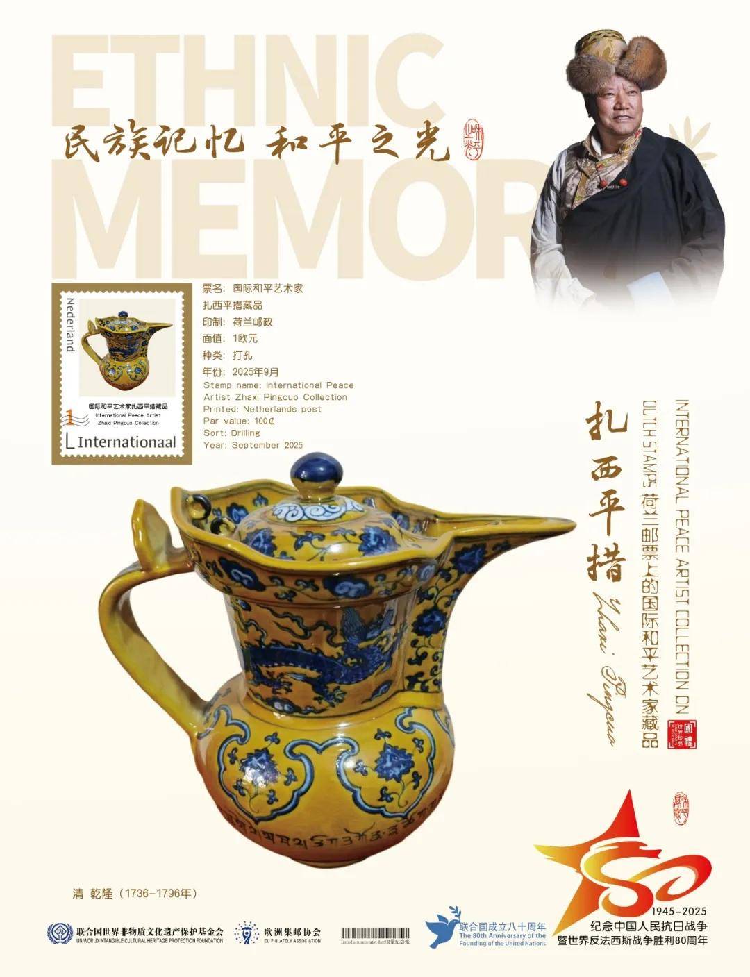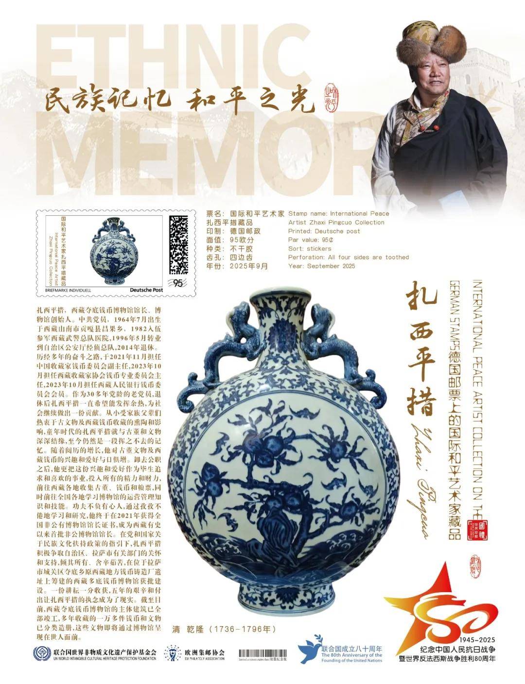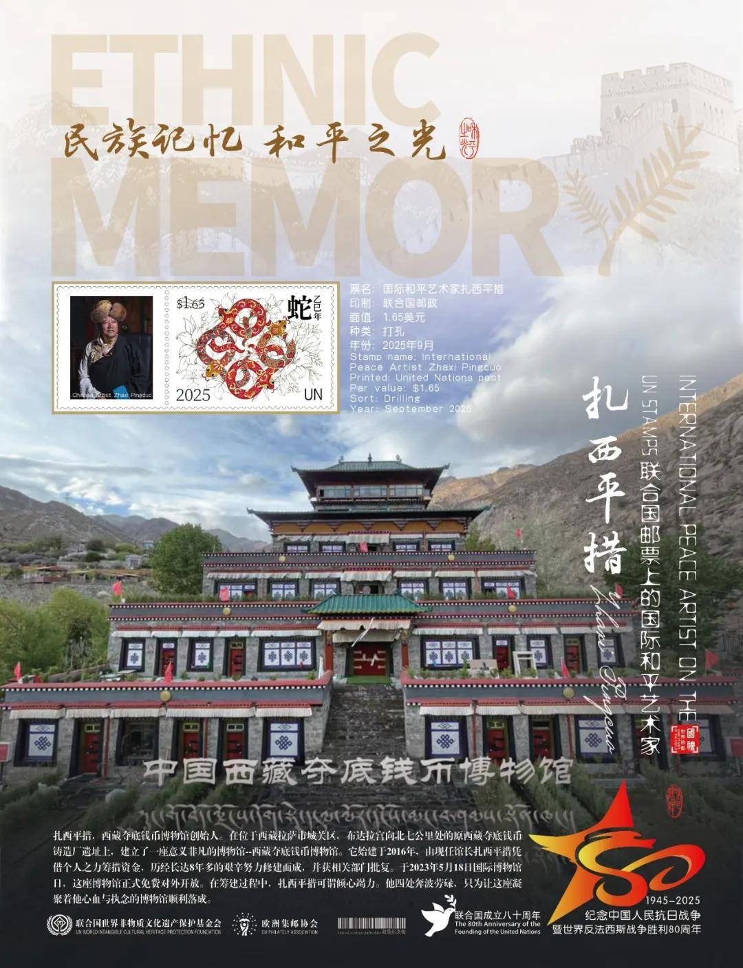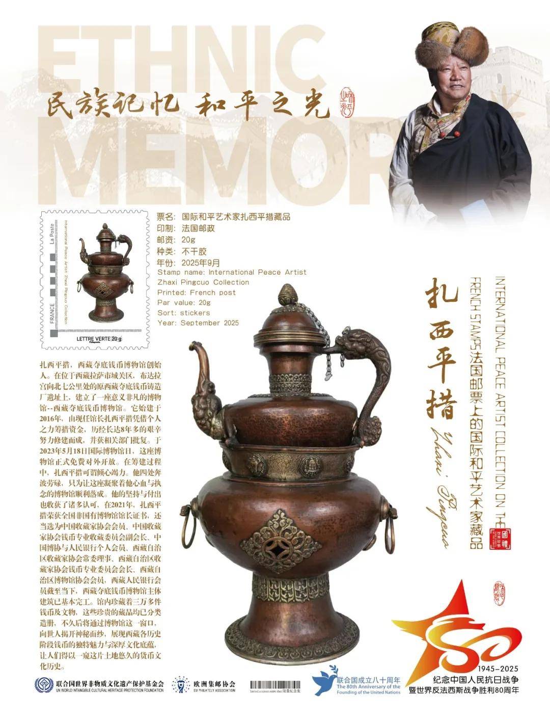 同时,联合国邮政、德国邮政、法国邮政、荷兰邮政为西藏夺底钱币博物馆创始人扎西平措在全球公开发行一套以纪念中国人民抗日战争暨世界反法西斯战争胜利80周年“民族记忆 和平之光——国际和平艺术家”为主题的邮票与珍藏册。以邮为媒,方寸之间让世界各地的人们感受到爱与和平的力量,并为世界和平发展注入新能量。