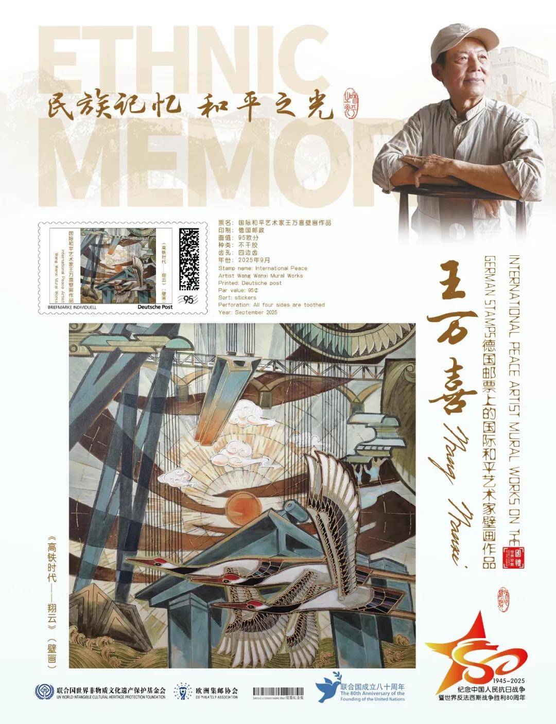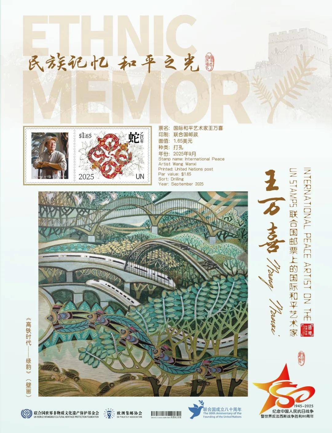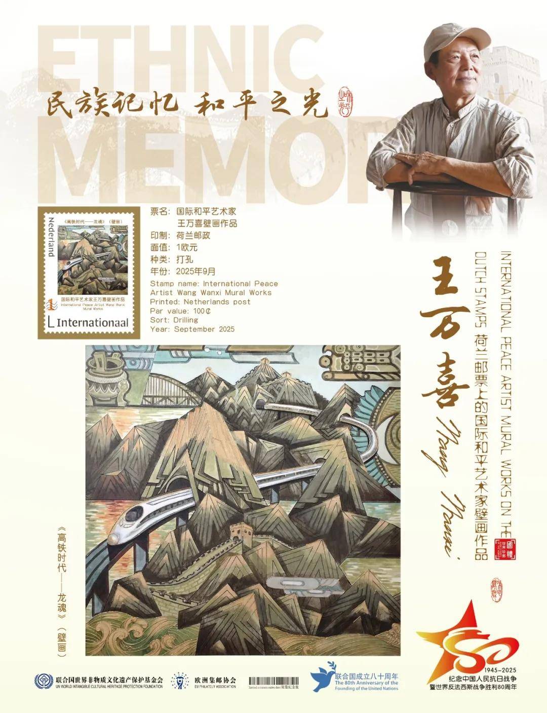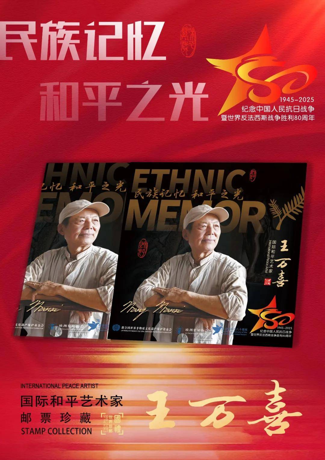 同时,联合国邮政、德国邮政、法国邮政、荷兰邮政为中国艺术名家王万喜在全球公开发行一套以纪念中国人民抗日战争暨世界反法西斯战争胜利80周年“民族记忆 和平之光——国际和平艺术家”为主题的邮票与珍藏册。以邮为媒,方寸之间让世界各地的人们感受到爱与和平的力量,并为世界和平发展注入新能量。