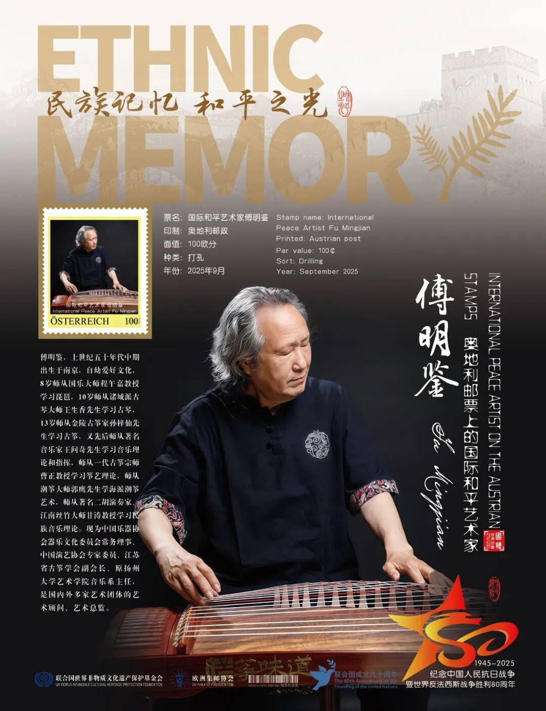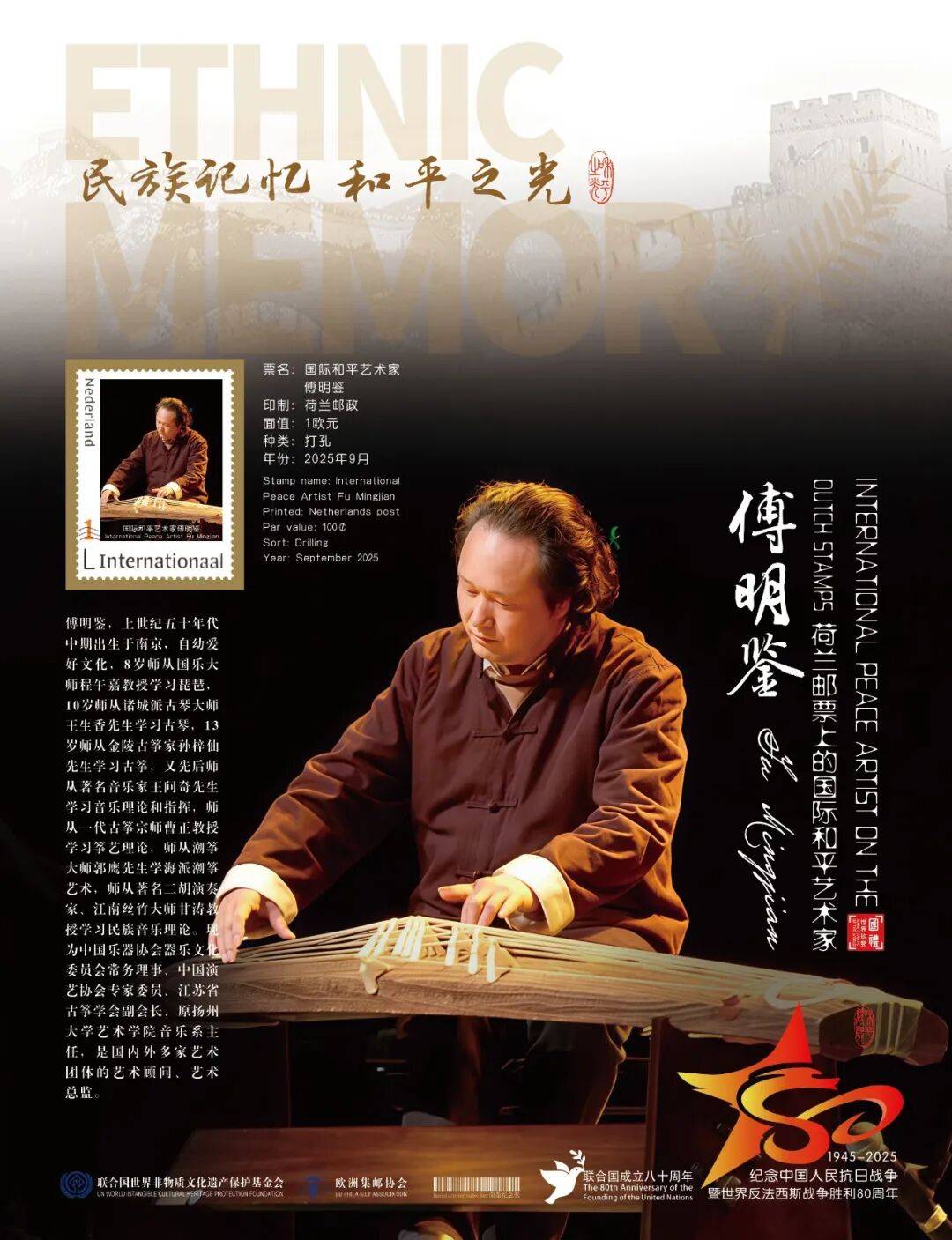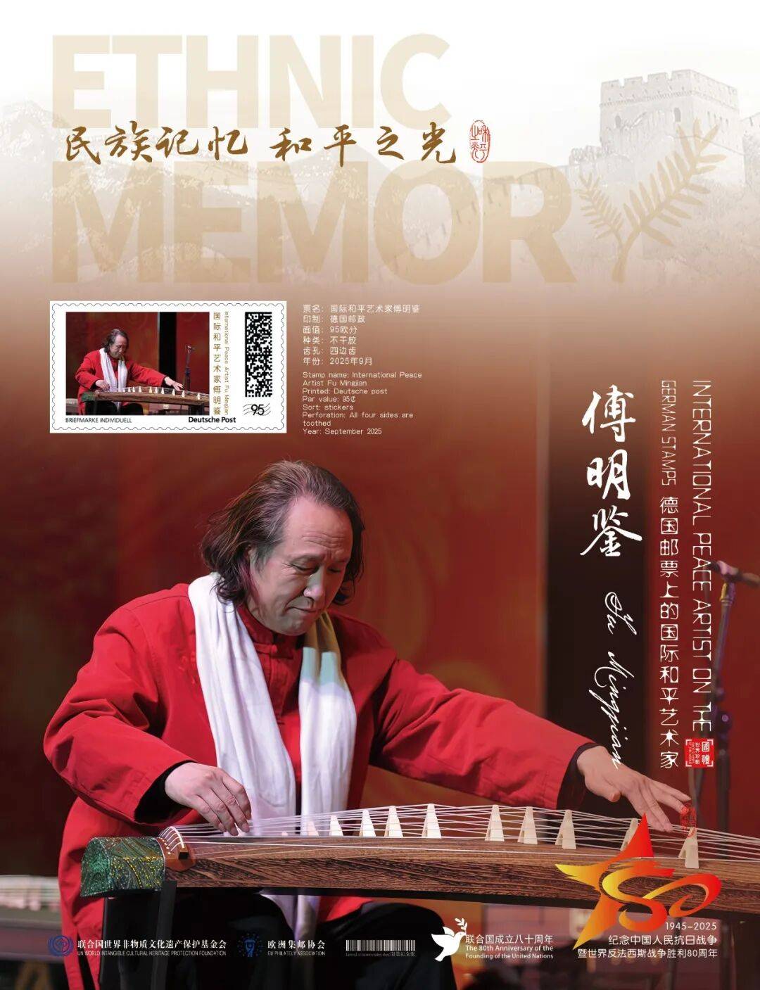 同时,联合国邮政、德国邮政、奥地利邮政、荷兰邮政为中国演奏名家傅明鉴在全球公开发行一套以纪念中国人民抗日战争暨世界反法西斯战争胜利80周年“民族记忆 和平之光——国际和平艺术家”为主题的邮票与珍藏册。以邮为媒,方寸之间让世界各地的人们感受到爱与和平的力量,并为世界和平发展注入新能量。