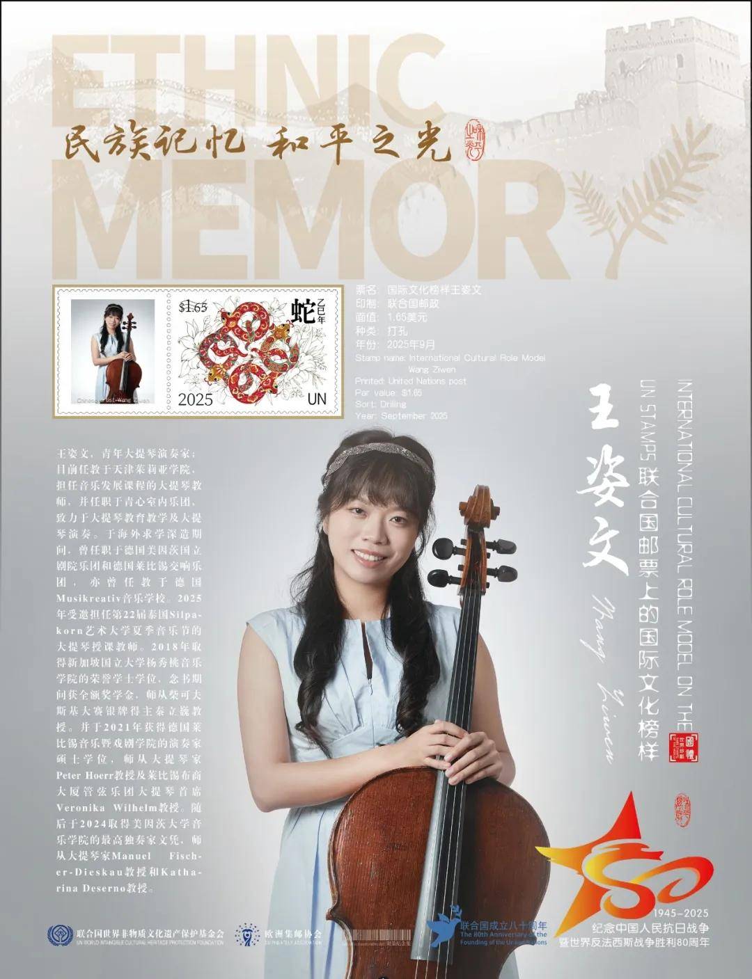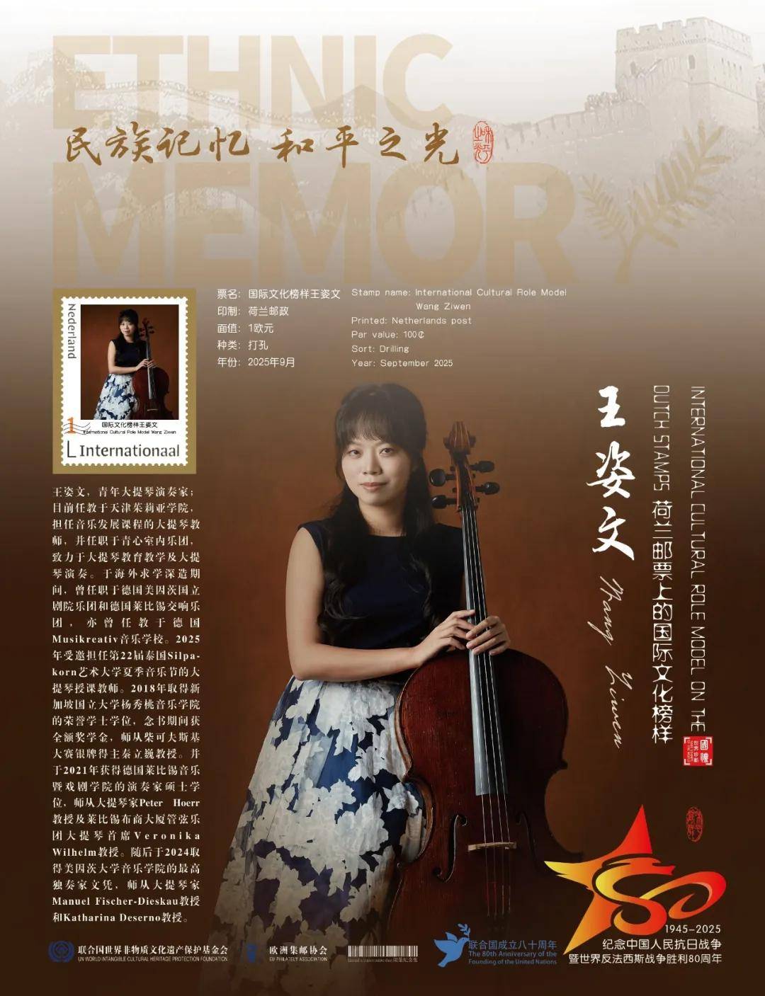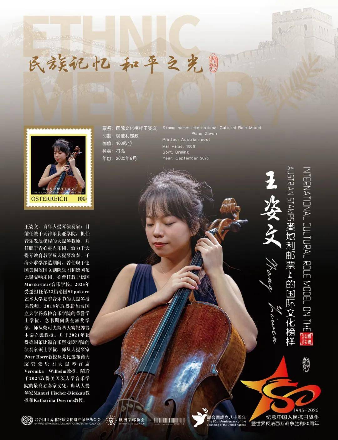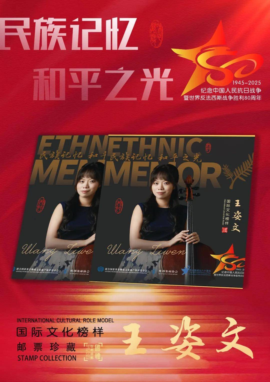 同时,联合国邮政、德国邮政、奥地利邮政、荷兰邮政为中国演奏名家王姿文在全球公开发行一套以纪念中国人民抗日战争暨世界反法西斯战争胜利80周年“民族记忆 和平之光——国际文化榜样”为主题的邮票与珍藏册。以邮为媒,方寸之间让世界各地的人们感受到爱与和平的力量,并为世界和平发展注入新能量。