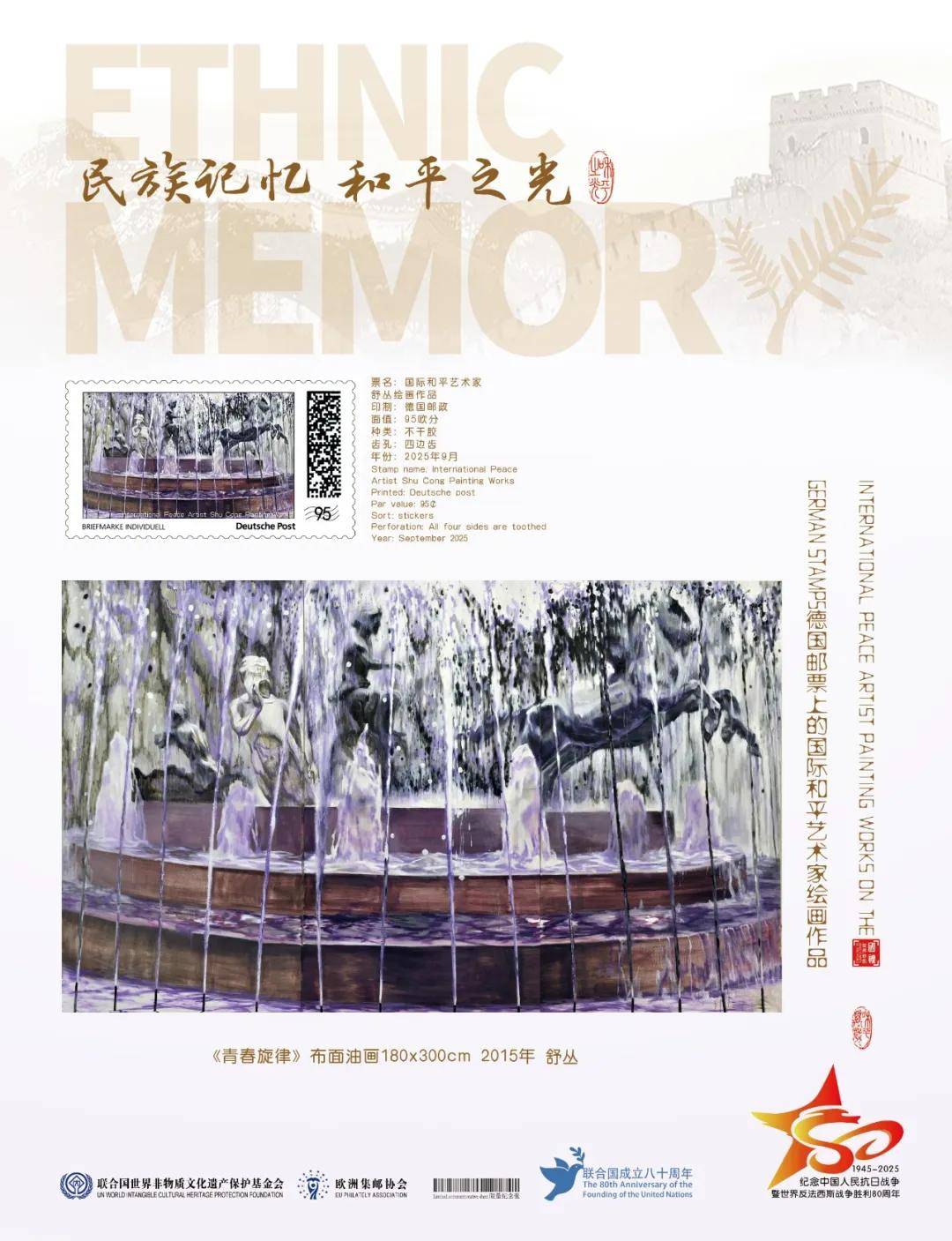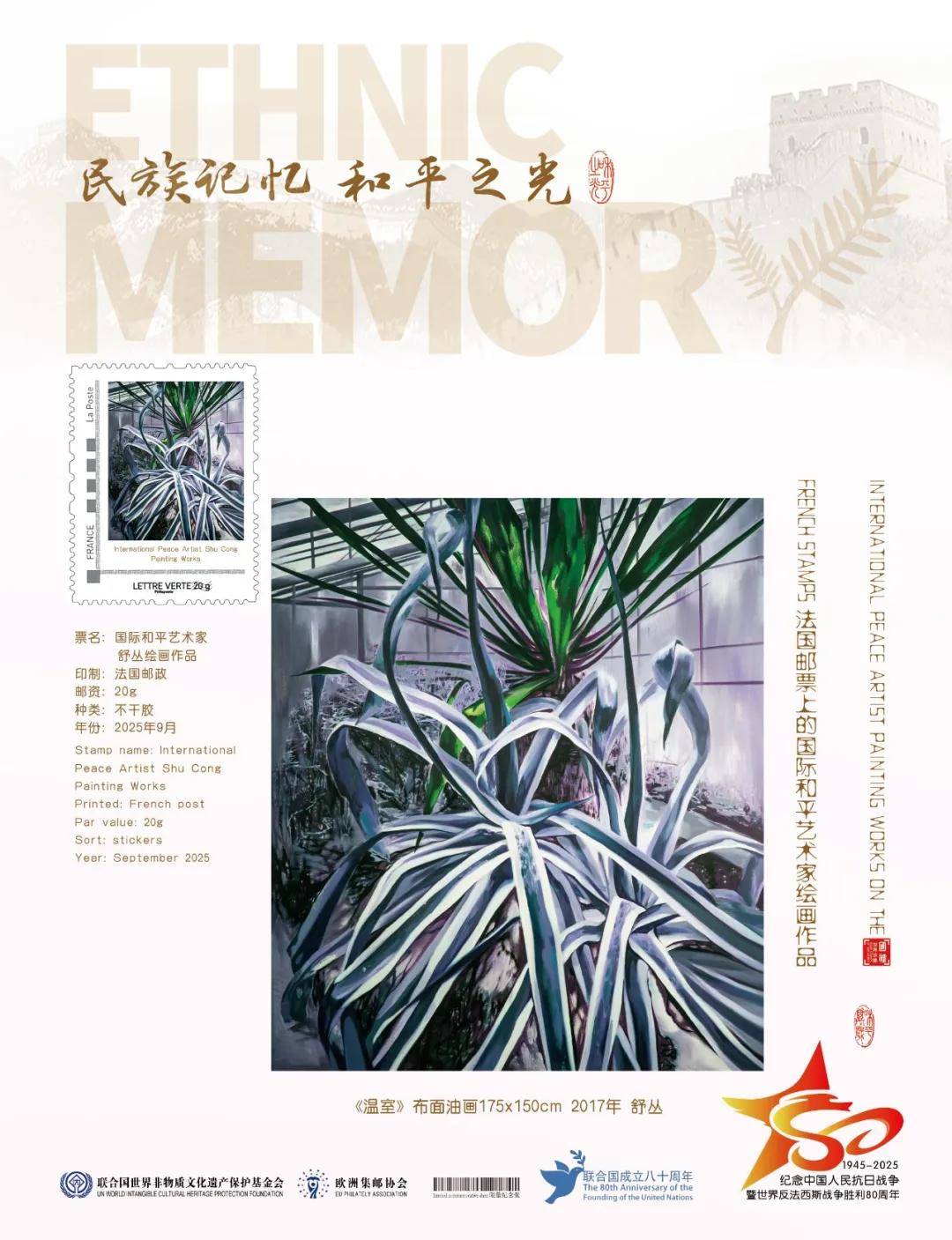 同时,联合国邮政、德国邮政、法国邮政、荷兰邮政为中国绘画名家舒丛在全球公开发行一套以纪念中国人民抗日战争暨世界反法西斯战争胜利80周年“民族记忆 和平之光——国际和平艺术家”为主题的邮票与珍藏册。以邮为媒,方寸之间让世界各地的人们感受到爱与和平的力量,并为世界和平发展注入新能量。