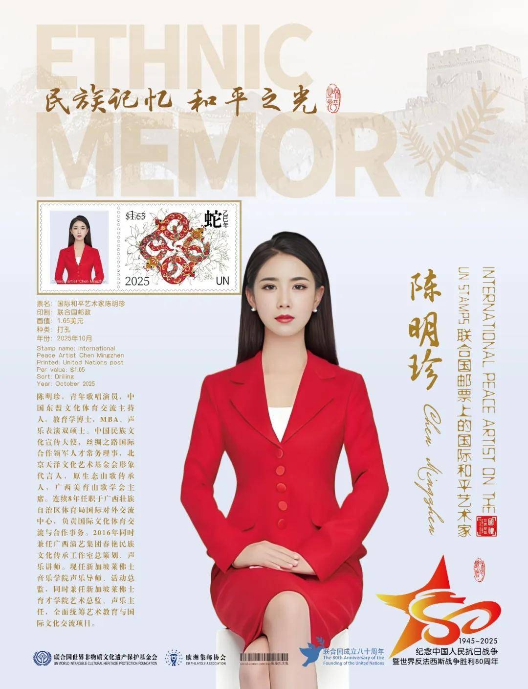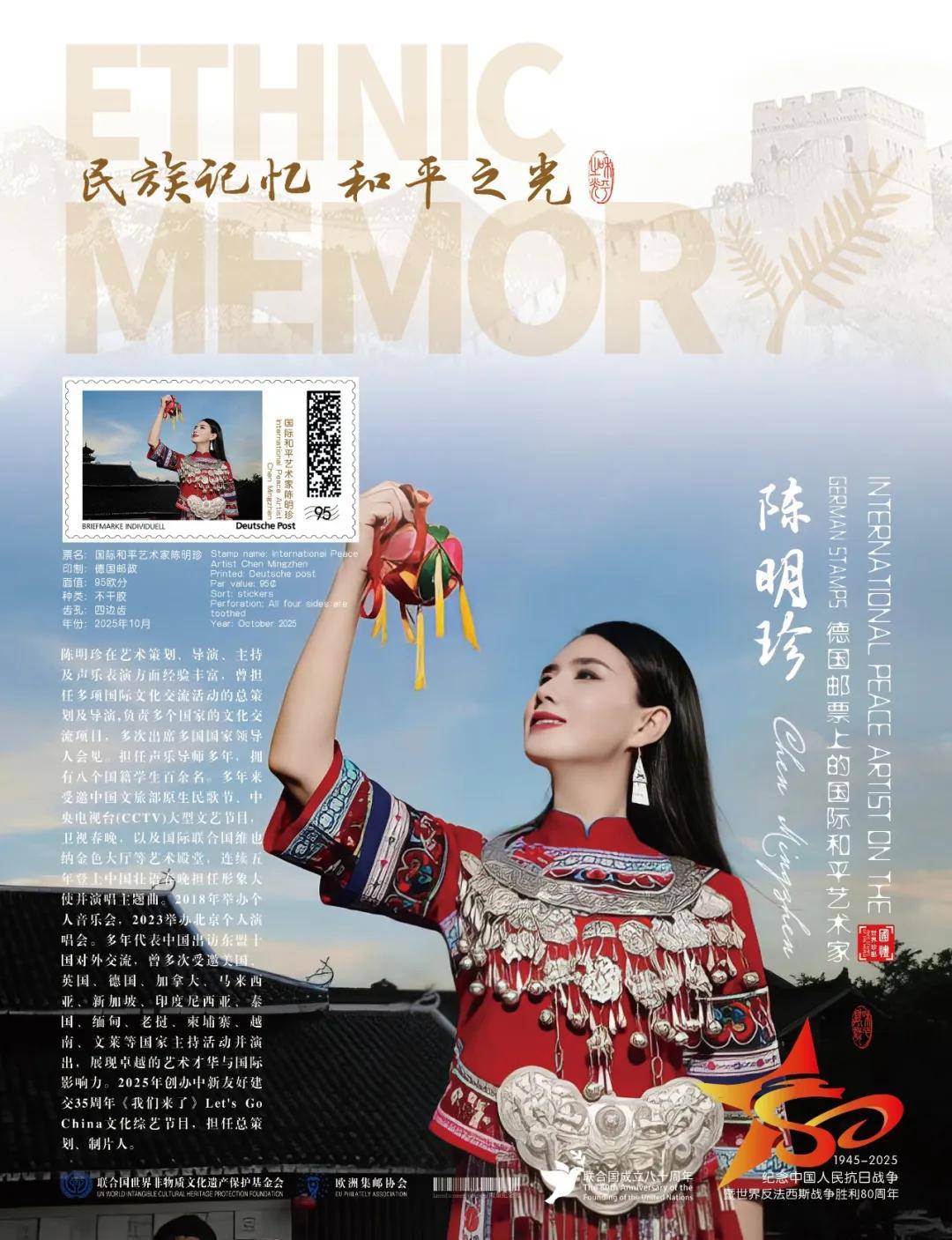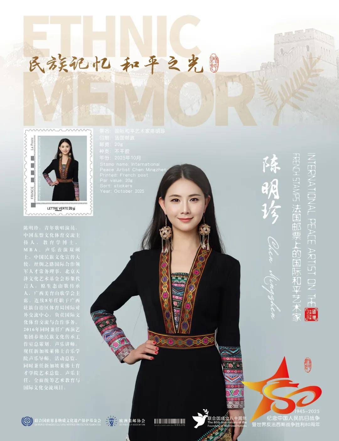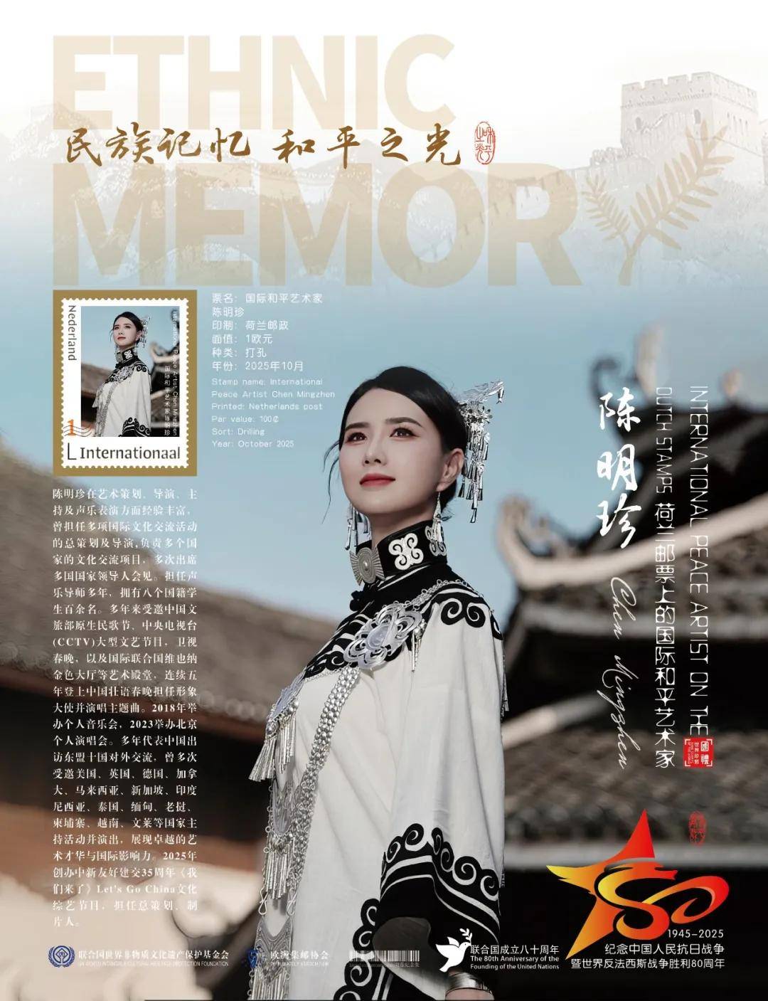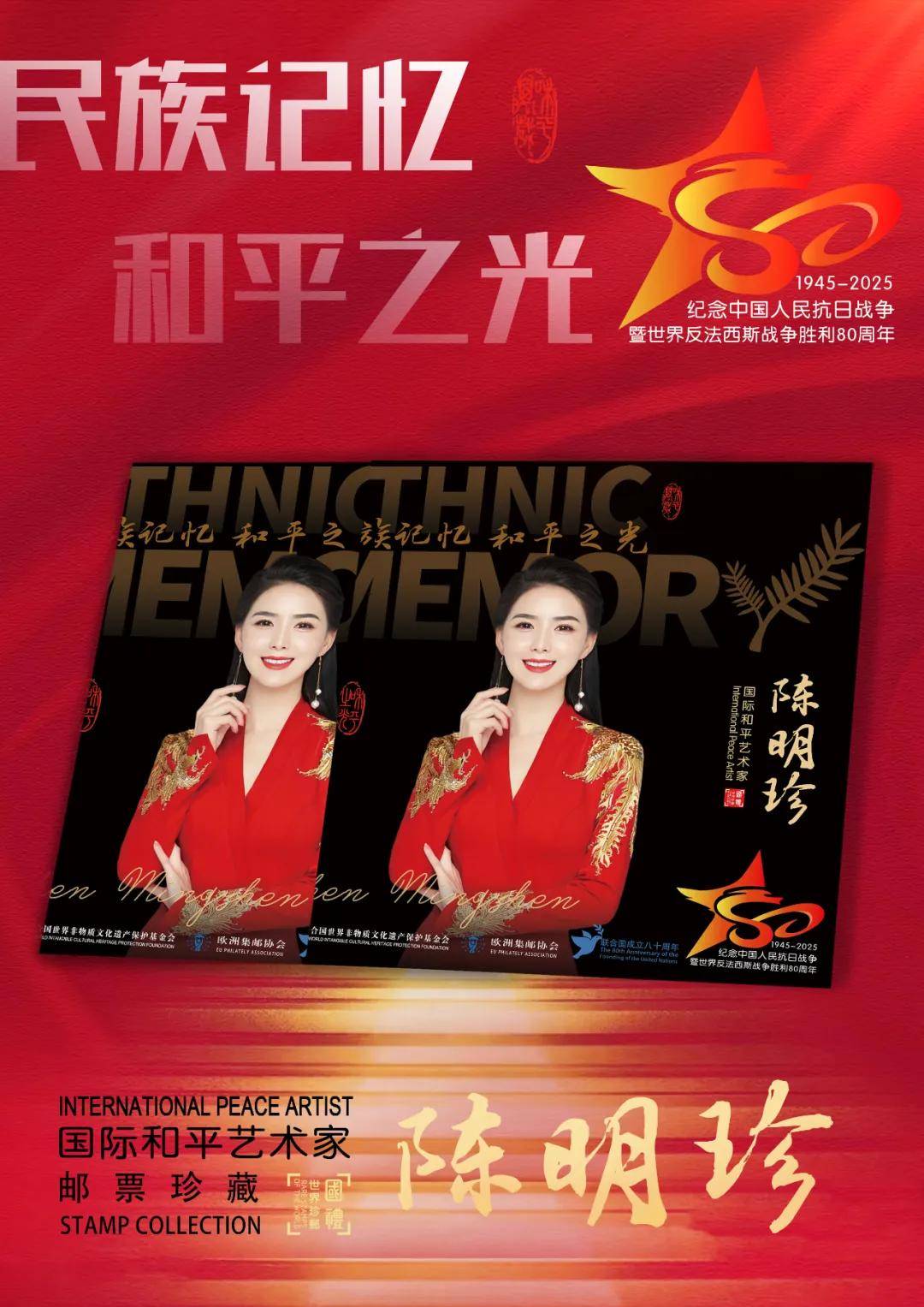 同时,联合国邮政、德国邮政、法国邮政、荷兰邮政为中国艺术名家陈明珍在全球公开发行一套以纪念中国人民抗日战争暨世界反法西斯战争胜利80周年“民族记忆 和平之光——国际和平艺术家”为主题的邮票与珍藏册。以邮为媒,方寸之间让世界各地的人们感受到爱与和平的力量,并为世界和平发展注入新能量。