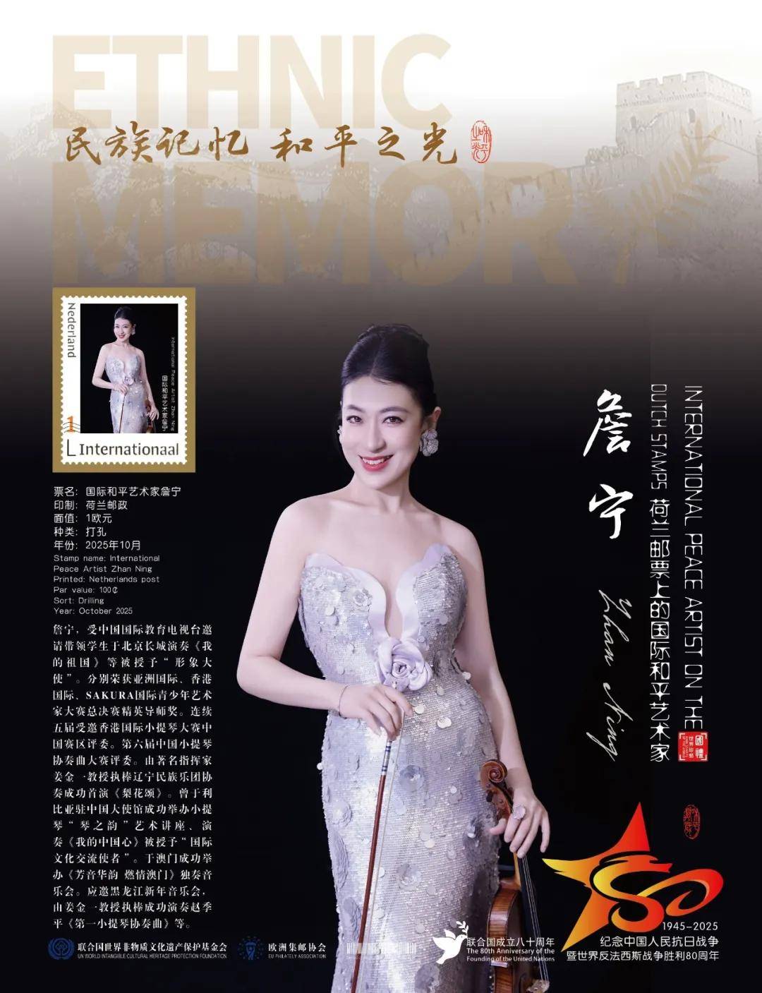 同时,联合国邮政、德国邮政、奥地利邮政、荷兰邮政为中国演奏名家詹宁在全球公开发行一套以纪念中国人民抗日战争暨世界反法西斯战争胜利80周年“民族记忆 和平之光——国际和平艺术家”为主题的邮票与珍藏册。以邮为媒,方寸之间让世界各地的人们感受到爱与和平的力量,并为世界和平发展注入新能量。