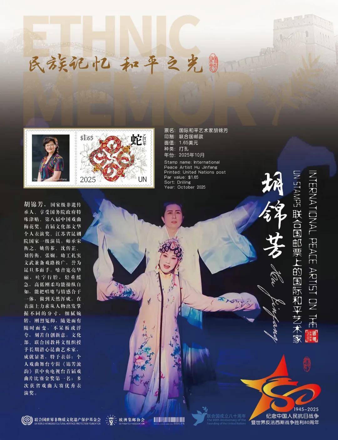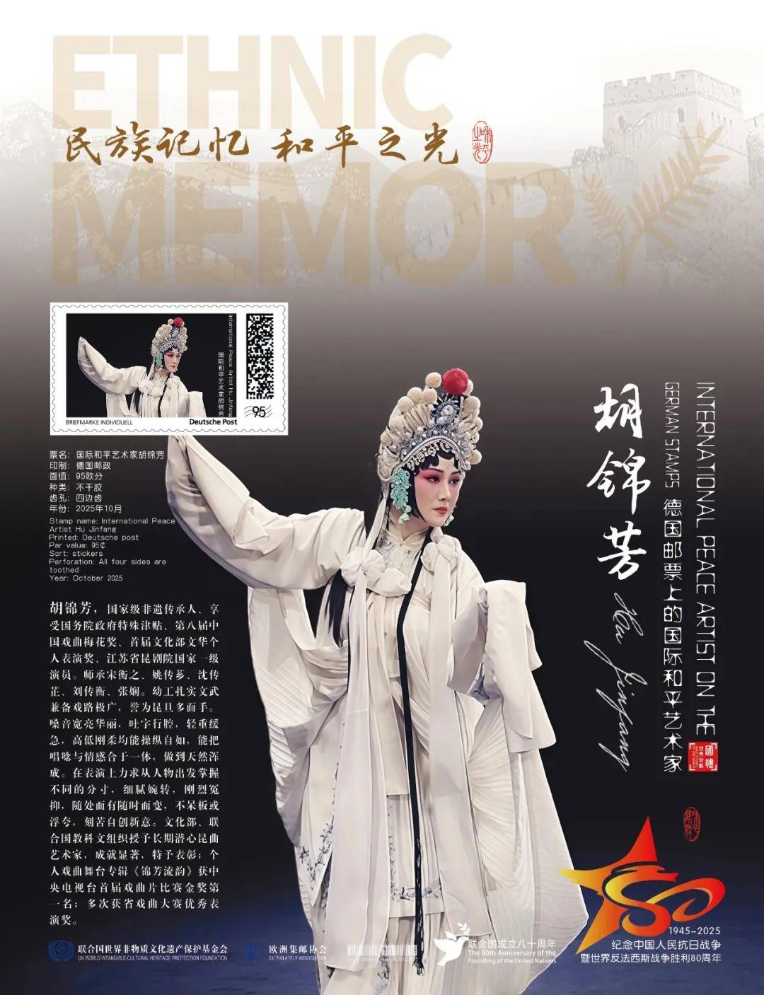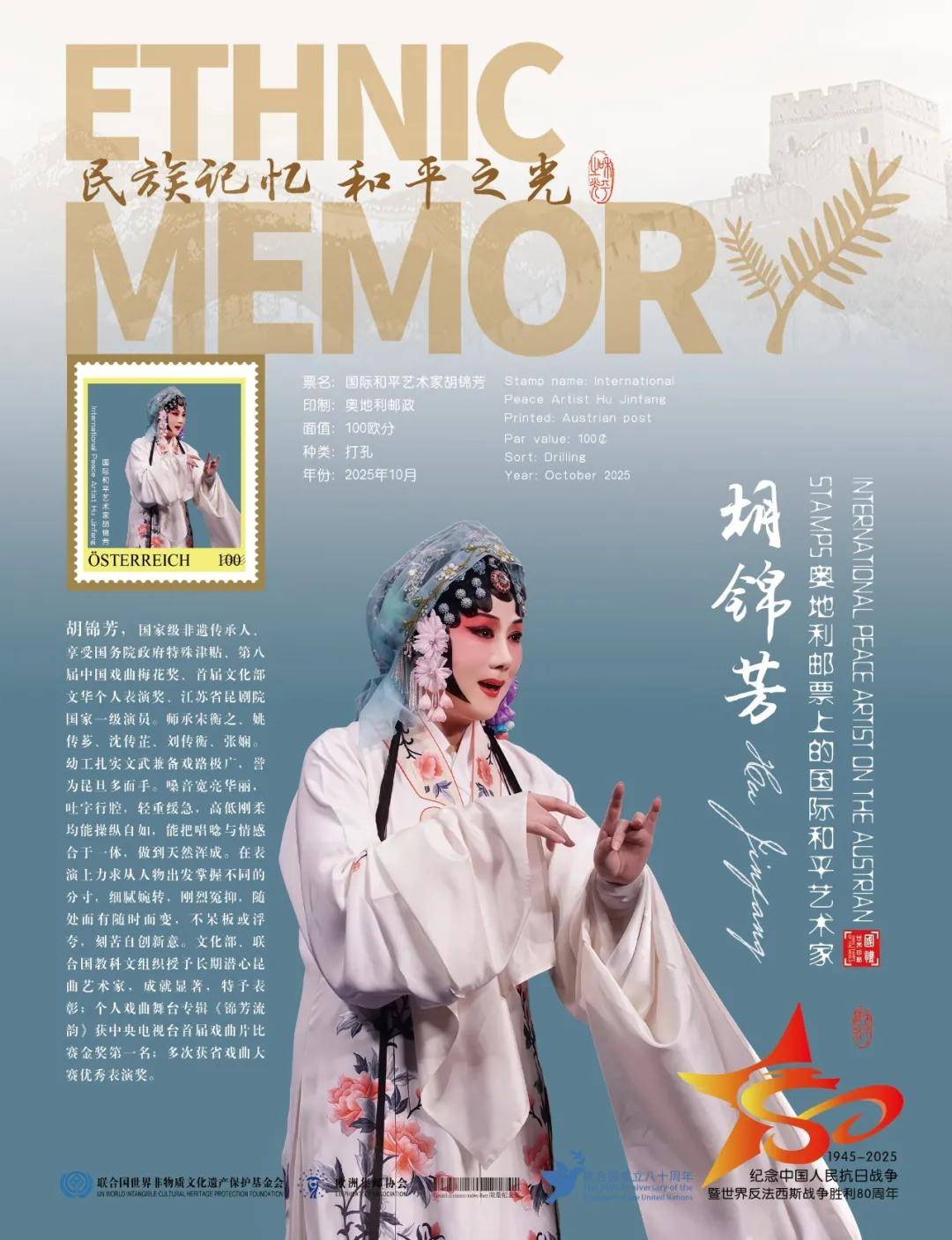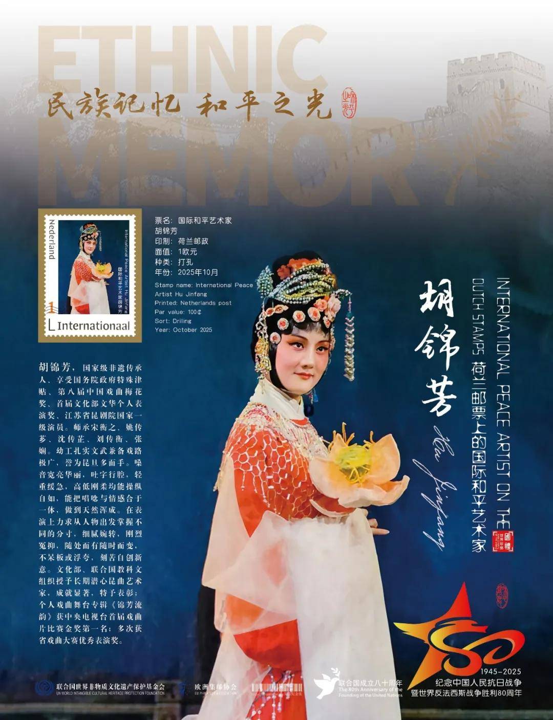 同时,联合国邮政、德国邮政、奥地利邮政、荷兰邮政为中国戏曲表演名家胡锦芳在全球公开发行一套以纪念中国人民抗日战争暨世界反法西斯战争胜利80周年“民族记忆 和平之光——国际和平艺术家”为主题的邮票与珍藏册。以邮为媒,方寸之间让世界各地的人们感受到爱与和平的力量,并为世界和平发展注入新能量。