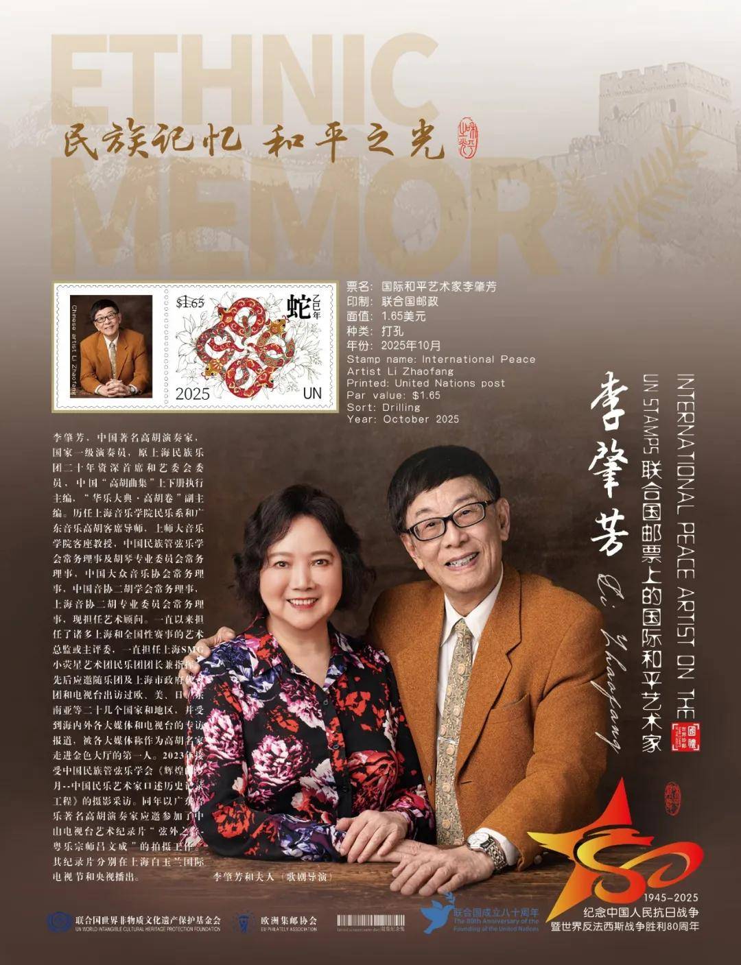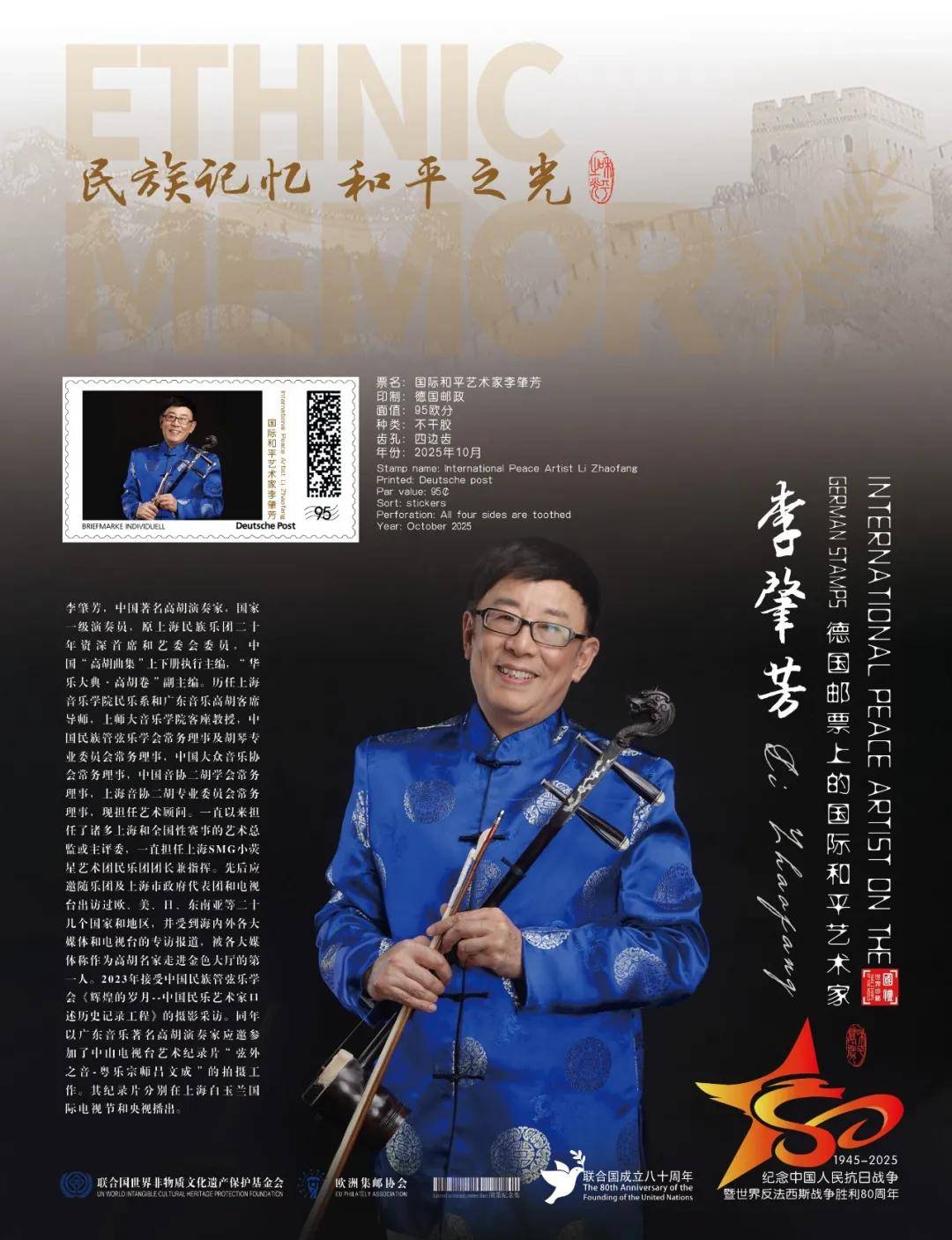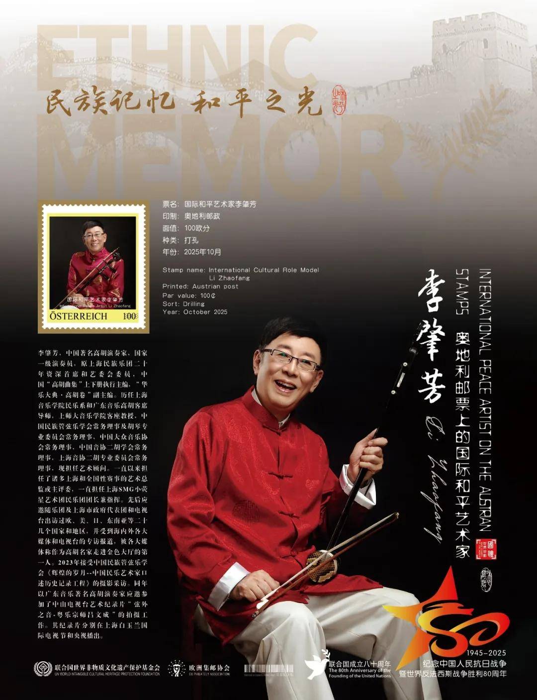 同时,联合国邮政、德国邮政、奥地利邮政、荷兰邮政为中国高胡演奏名家李肇芳在全球公开发行一套以纪念中国人民抗日战争暨世界反法西斯战争胜利80周年“民族记忆 和平之光——国际和平艺术家”为主题的邮票与珍藏册。以邮为媒,方寸之间让世界各地的人们感受到爱与和平的力量,并为世界和平发展注入新能量。