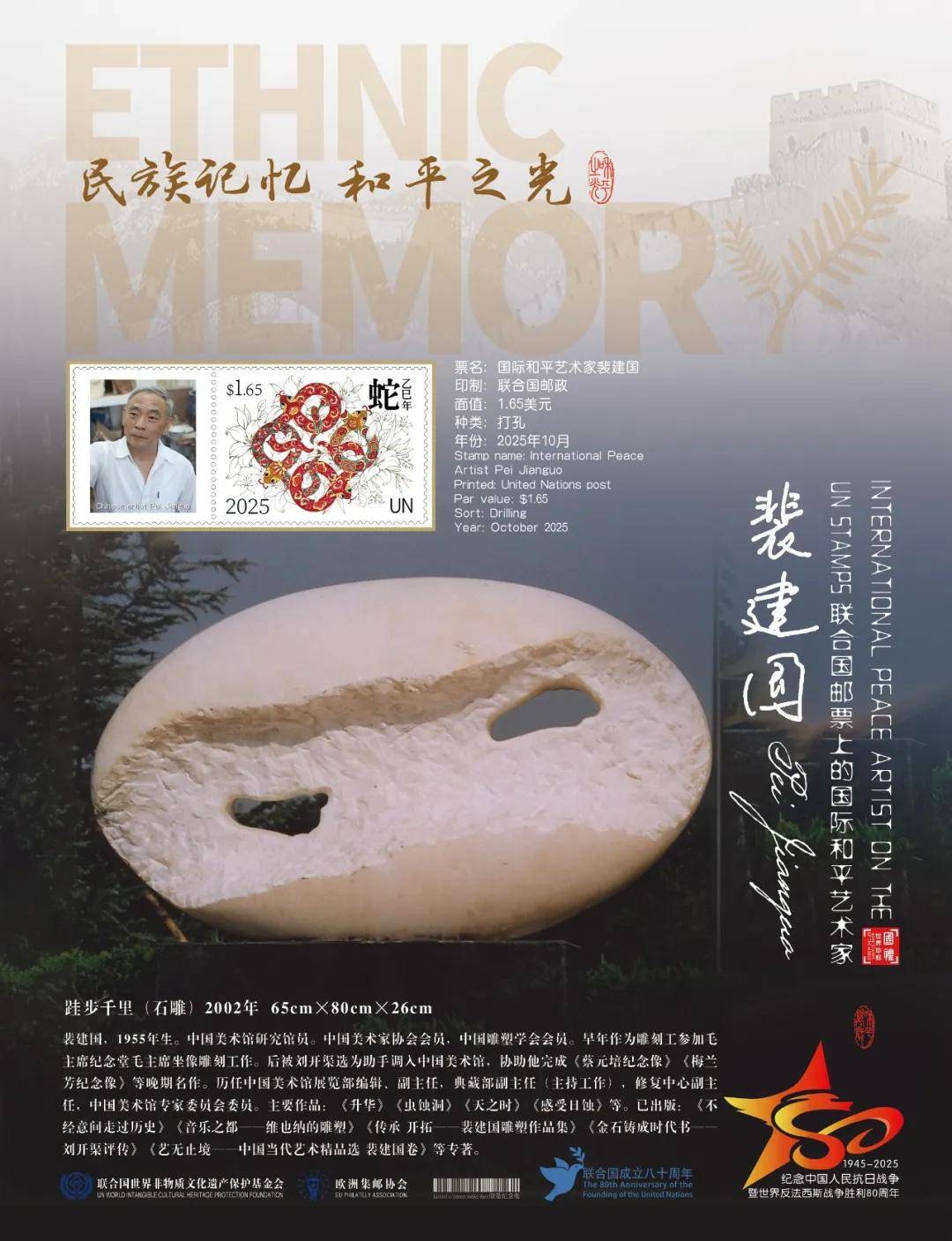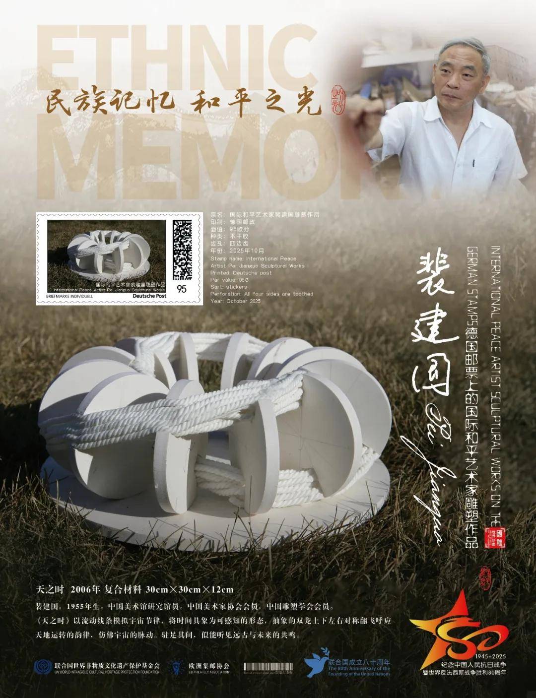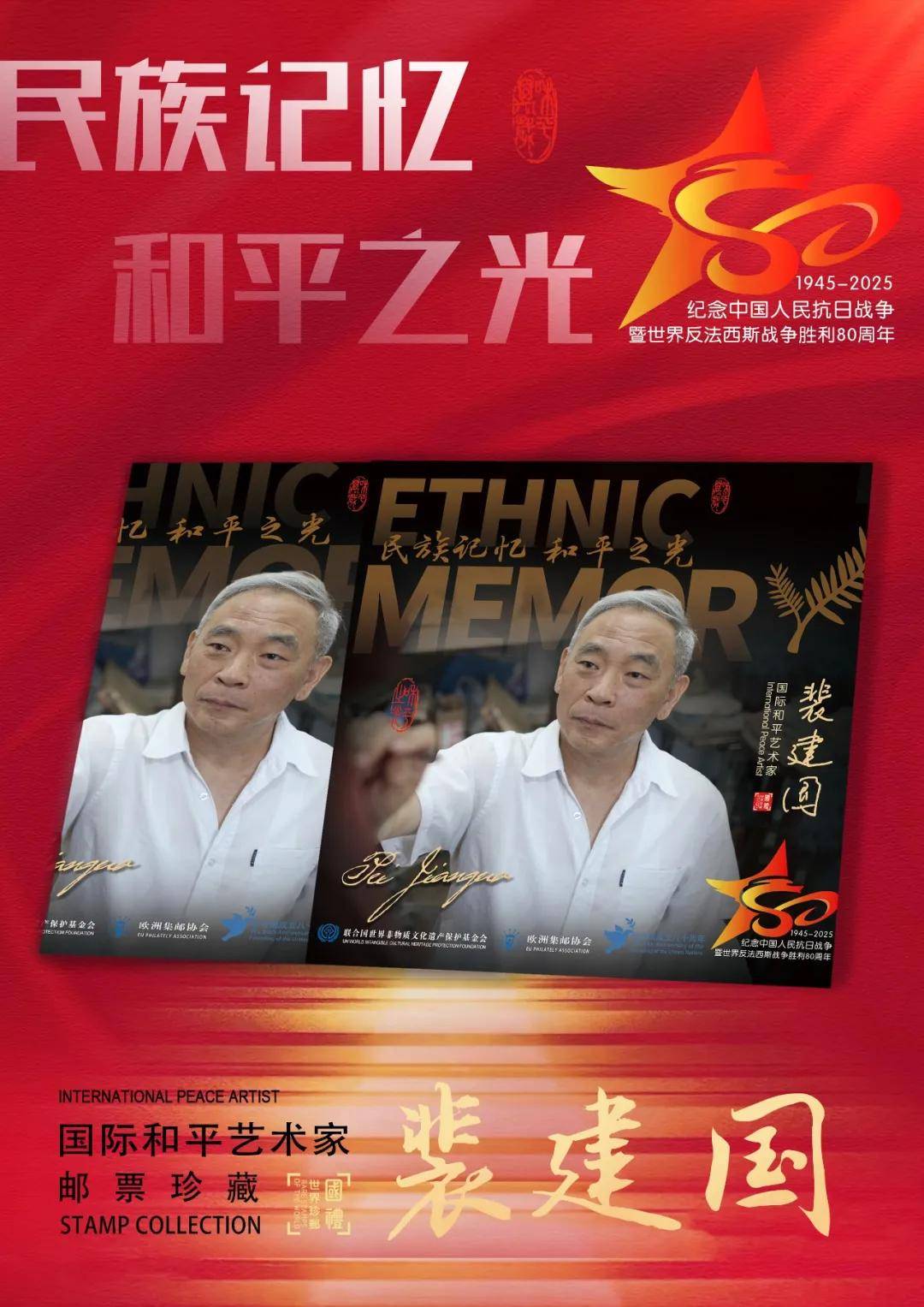 同时,联合国邮政、德国邮政、奥地利邮政、荷兰邮政为中国雕塑名家裴建国在全球公开发行一套以纪念中国人民抗日战争暨世界反法西斯战争胜利80周年“民族记忆 和平之光——国际和平艺术家”为主题的邮票与珍藏册。以邮为媒,方寸之间让世界各地的人们感受到爱与和平的力量,并为世界和平发展注入新能量。