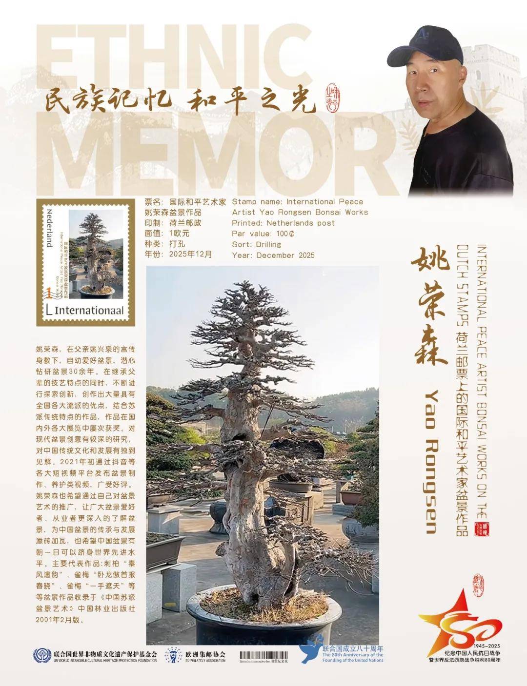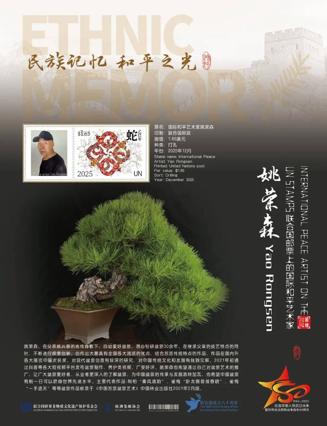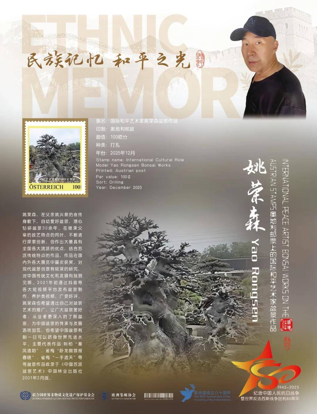 同时,联合国邮政、德国邮政、奥地利邮政、荷兰邮政为中国盆景艺术家姚荣森在全球公开发行一套以纪念中国人民抗日战争暨世界反法西斯战争胜利80周年“民族记忆 和平之光——国际和平艺术家”为主题的邮票与珍藏册。以邮为媒,方寸之间让世界各地的人们感受到爱与和平的力量,并为世界和平发展注入新能量。