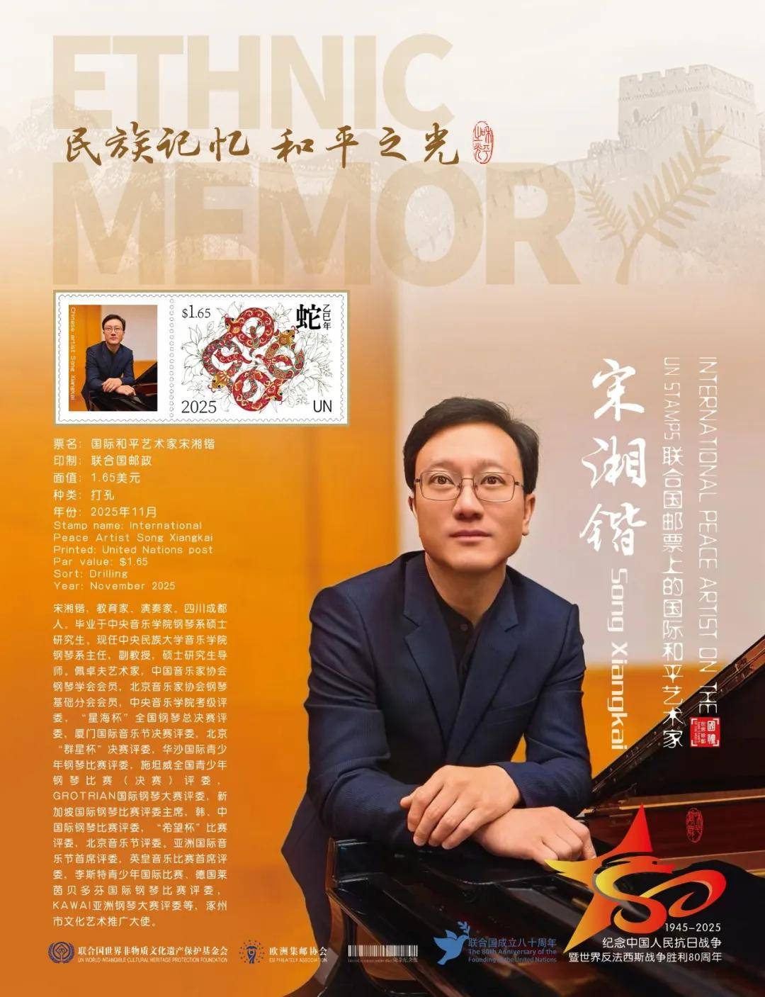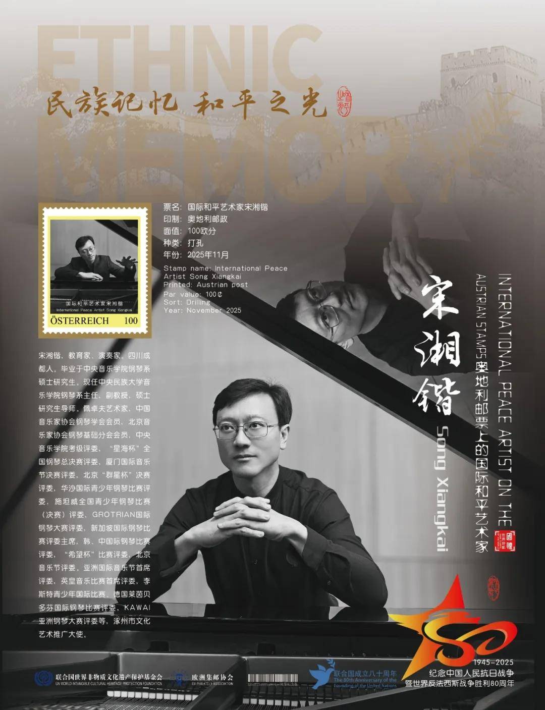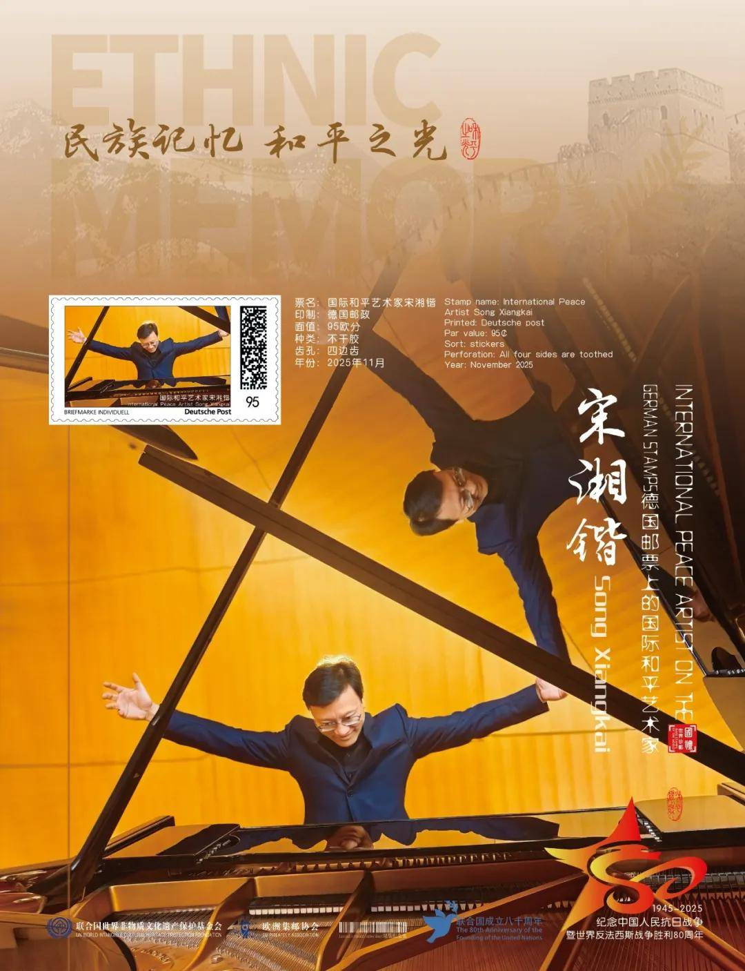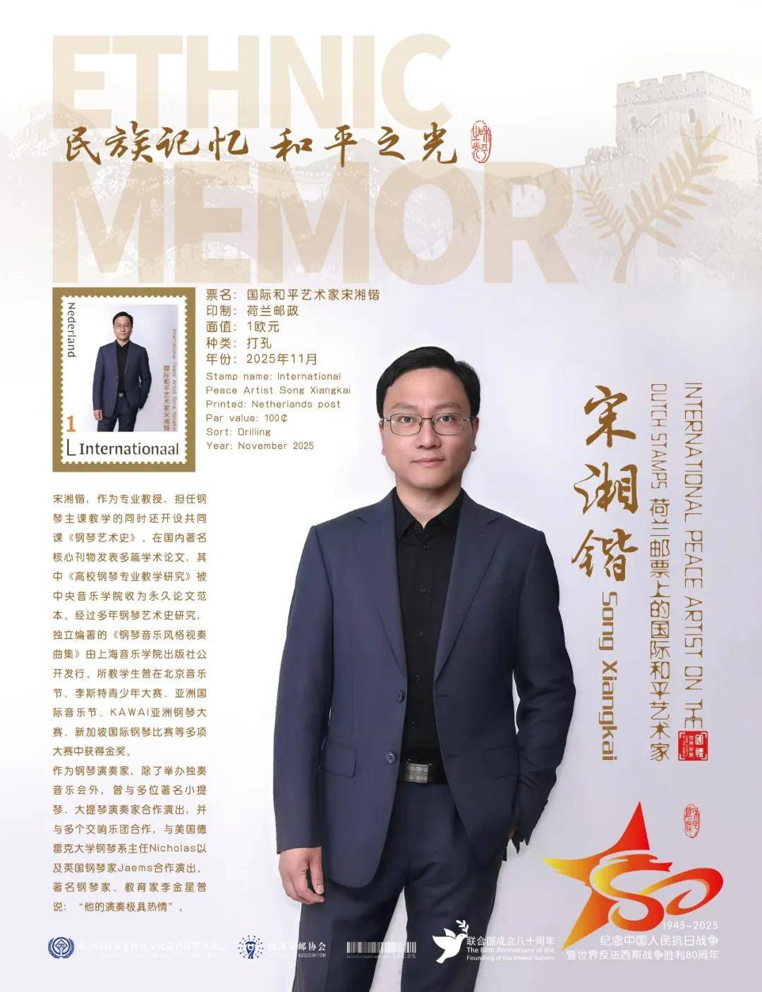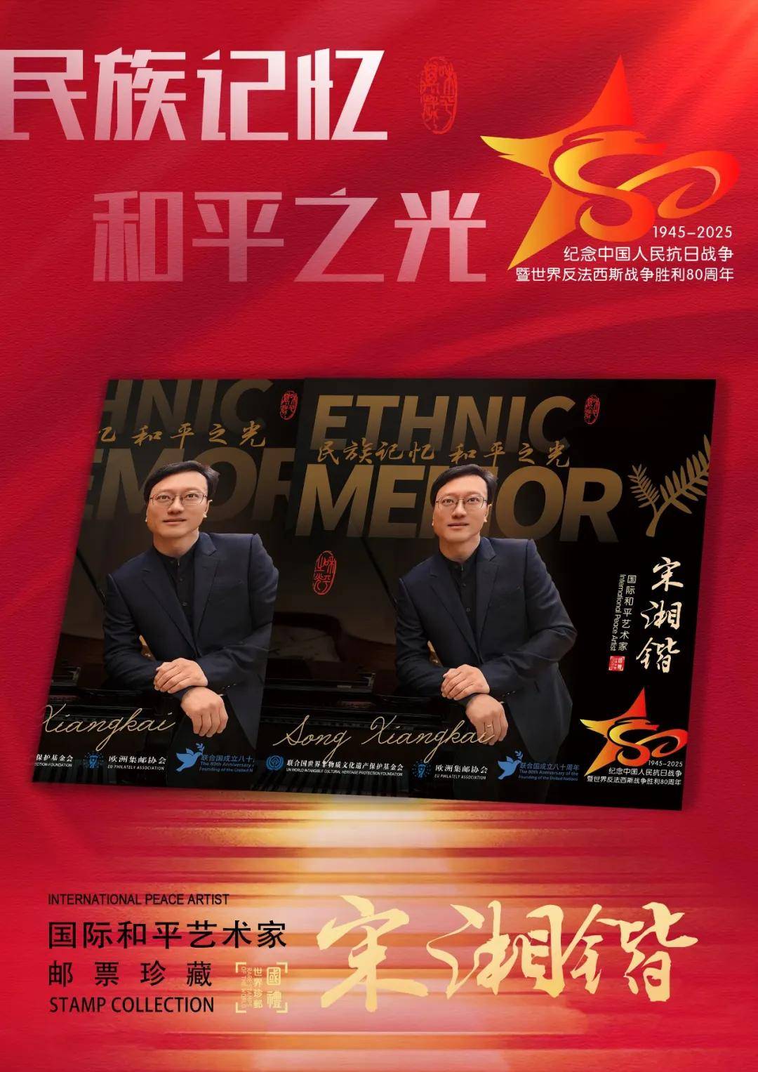 同时,联合国邮政、德国邮政、奥地利邮政、荷兰邮政为中国演奏名家宋湘锴在全球公开发行一套以纪念中国人民抗日战争暨世界反法西斯战争胜利80周年“民族记忆 和平之光——国际和平艺术家”为主题的邮票与珍藏册。以邮为媒,方寸之间让世界各地的人们感受到爱与和平的力量,并为世界和平发展注入新能量。