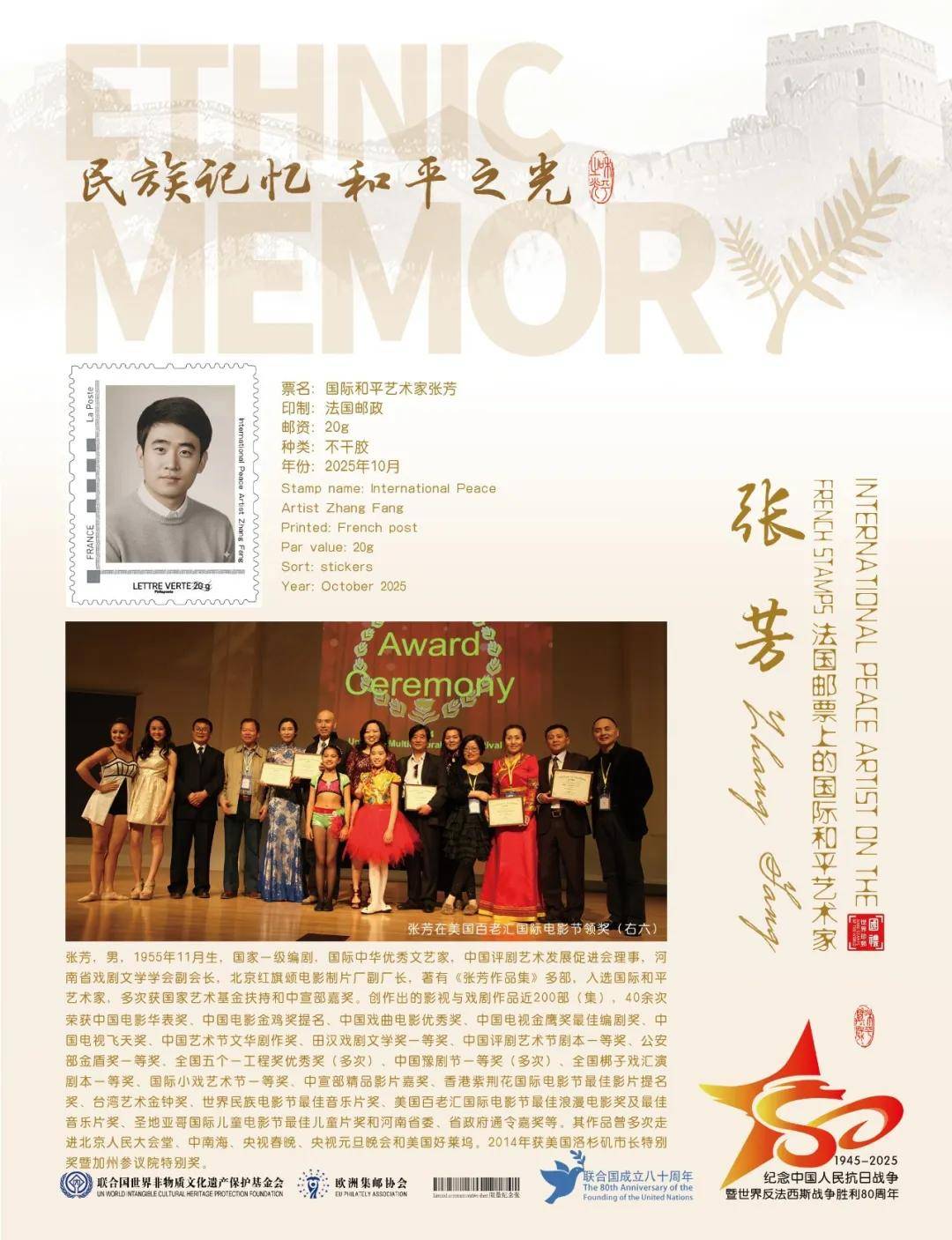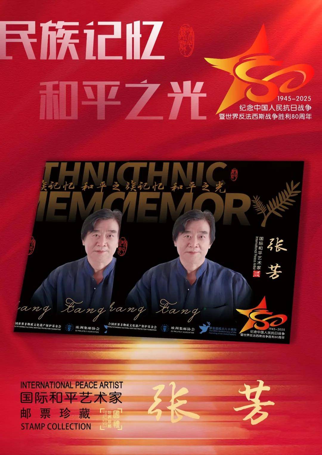 同时,联合国邮政、德国邮政、法国邮政、荷兰邮政为中国著名编剧张芳在全球公开发行一套以纪念中国人民抗日战争暨世界反法西斯战争胜利80周年“民族记忆 和平之光——国际和平艺术家”为主题的邮票与珍藏册。以邮为媒,方寸之间让世界各地的人们感受到爱与和平的力量,并为世界和平发展注入新能量。