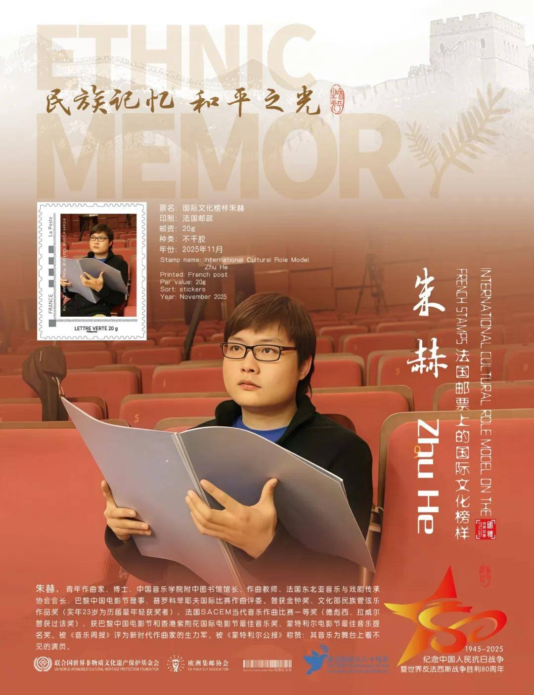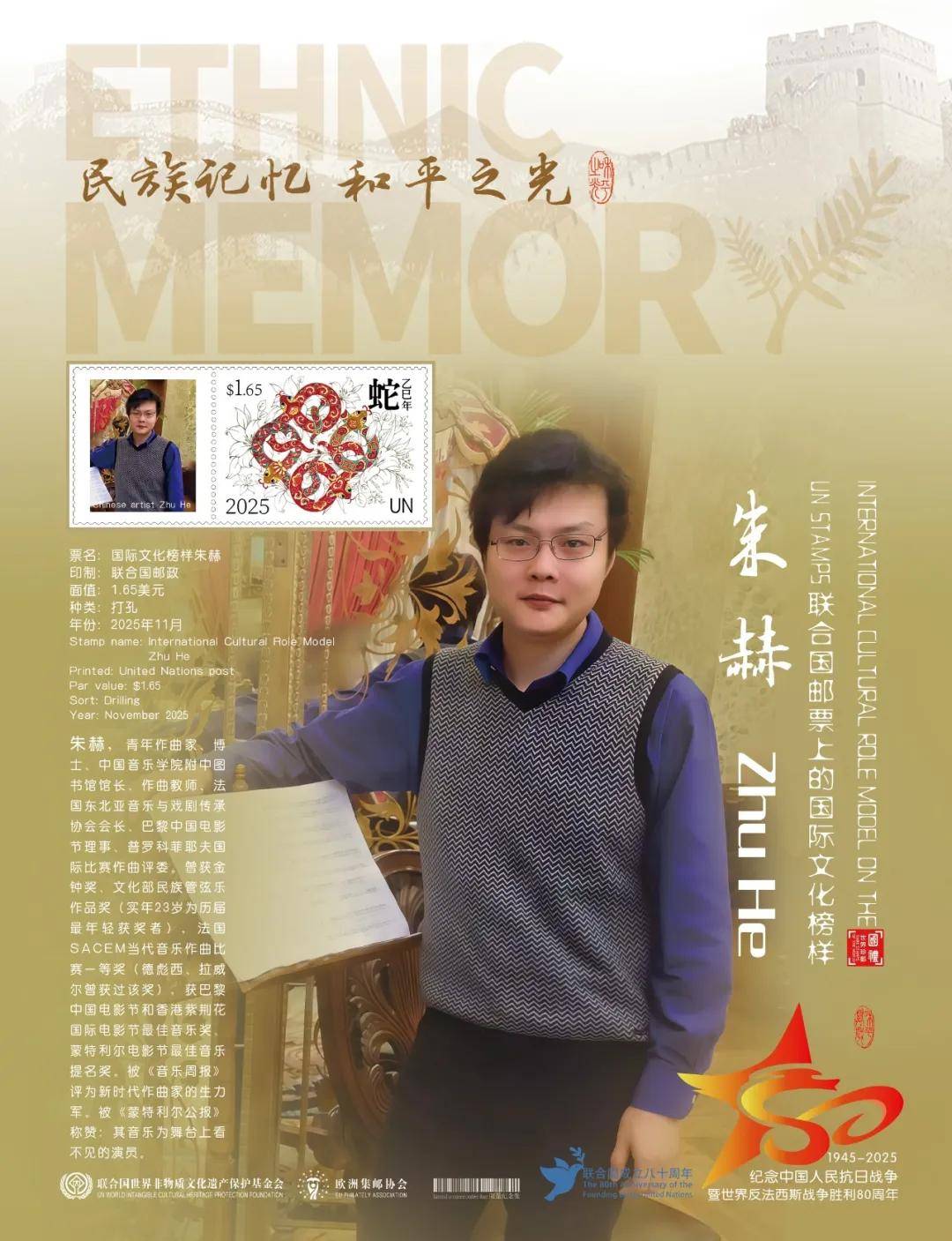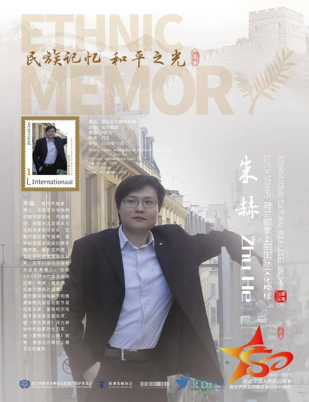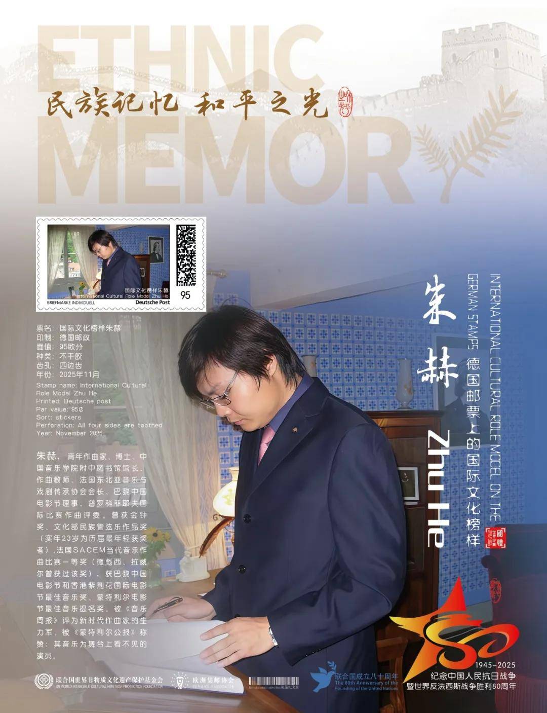 同时,联合国邮政、德国邮政、法国邮政、荷兰邮政为中国著名作曲家朱赫在全球公开发行一套以纪念中国人民抗日战争暨世界反法西斯战争胜利80周年“民族记忆 和平之光——国际文化榜样”为主题的邮票与珍藏册。以邮为媒,方寸之间让世界各地的人们感受到爱与和平的力量,并为世界和平发展注入新能量。