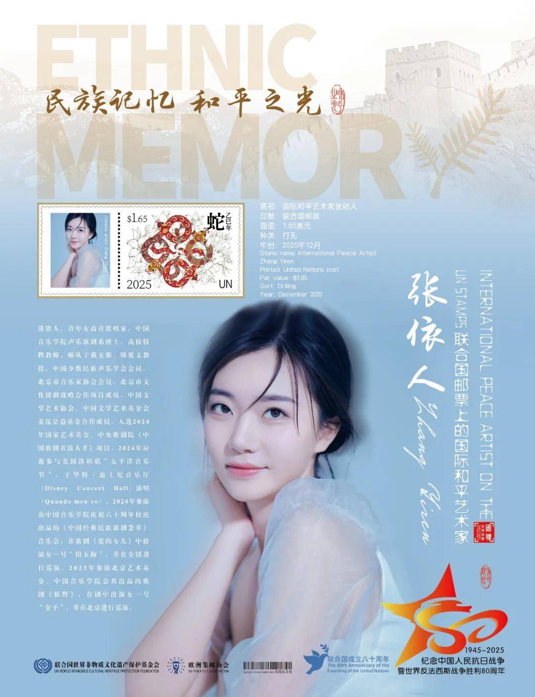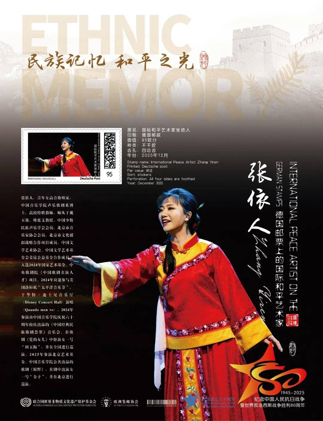 同时,联合国邮政、德国邮政、奥地利邮政、荷兰邮政为青年女高音歌唱家张依人在全球公开发行一套以纪念中国人民抗日战争暨世界反法西斯战争胜利80周年“民族记忆 和平之光——国际和平艺术家”为主题的邮票与珍藏册。以邮为媒,方寸之间让世界各地的人们感受到爱与和平的力量,并为世界和平发展注入新能量。