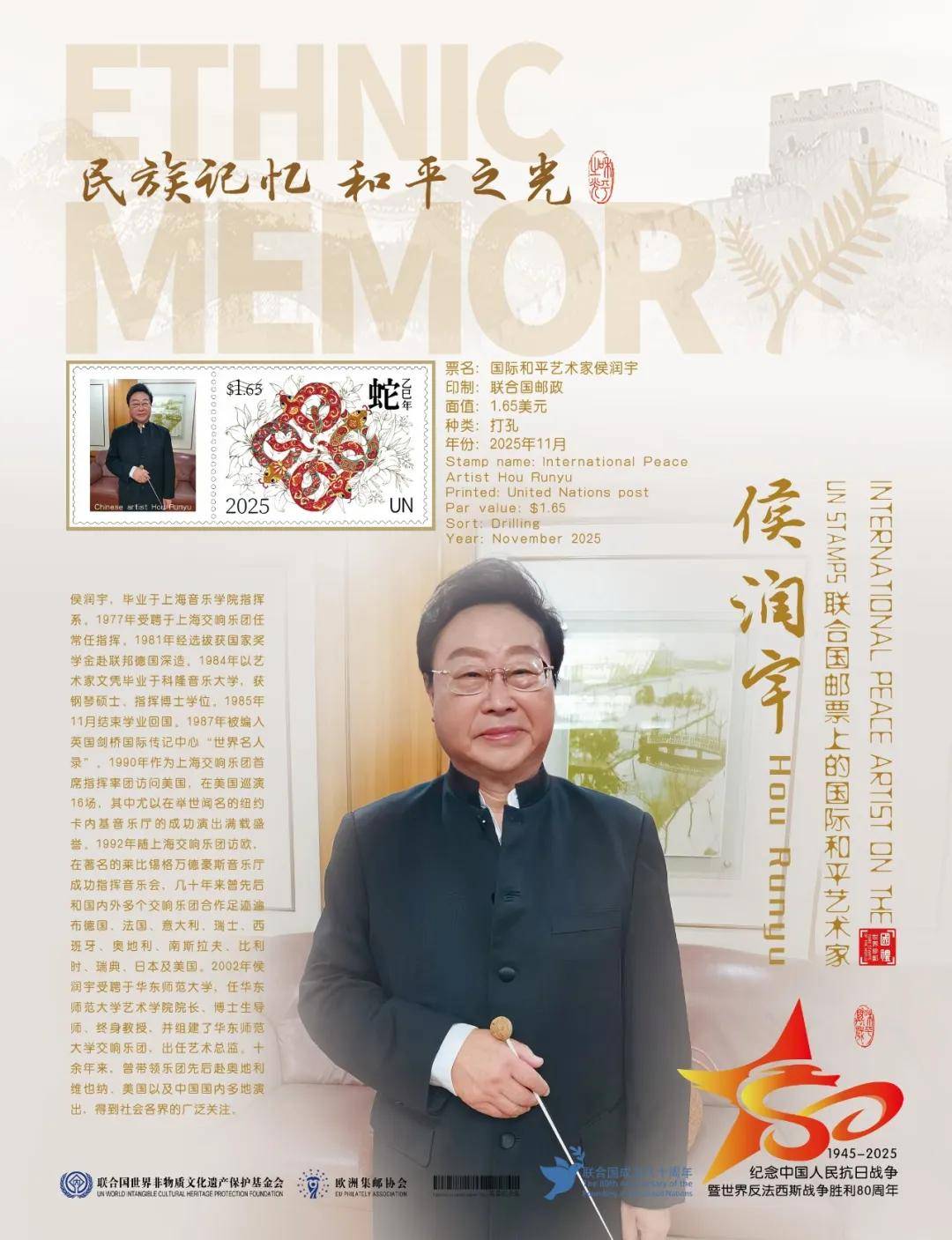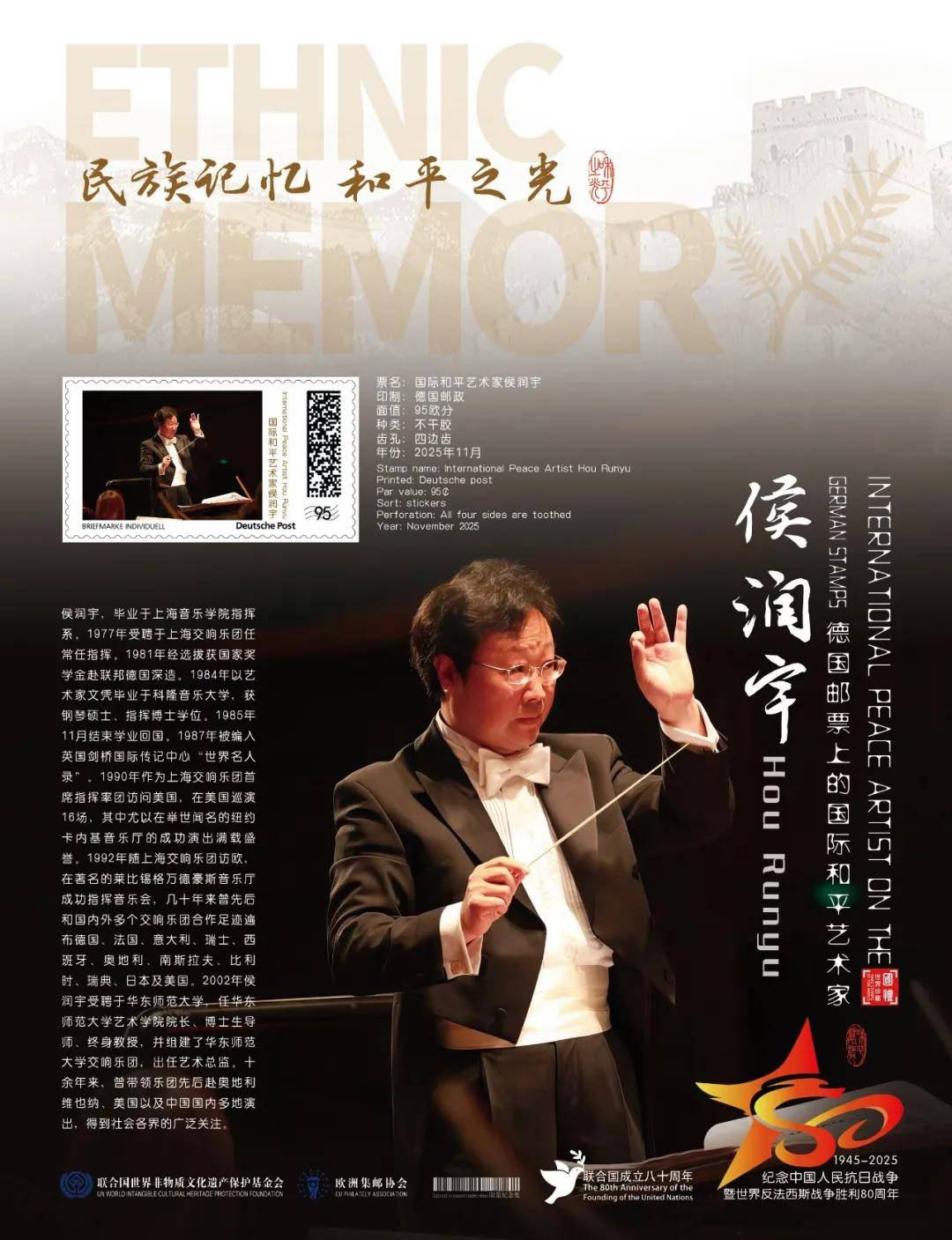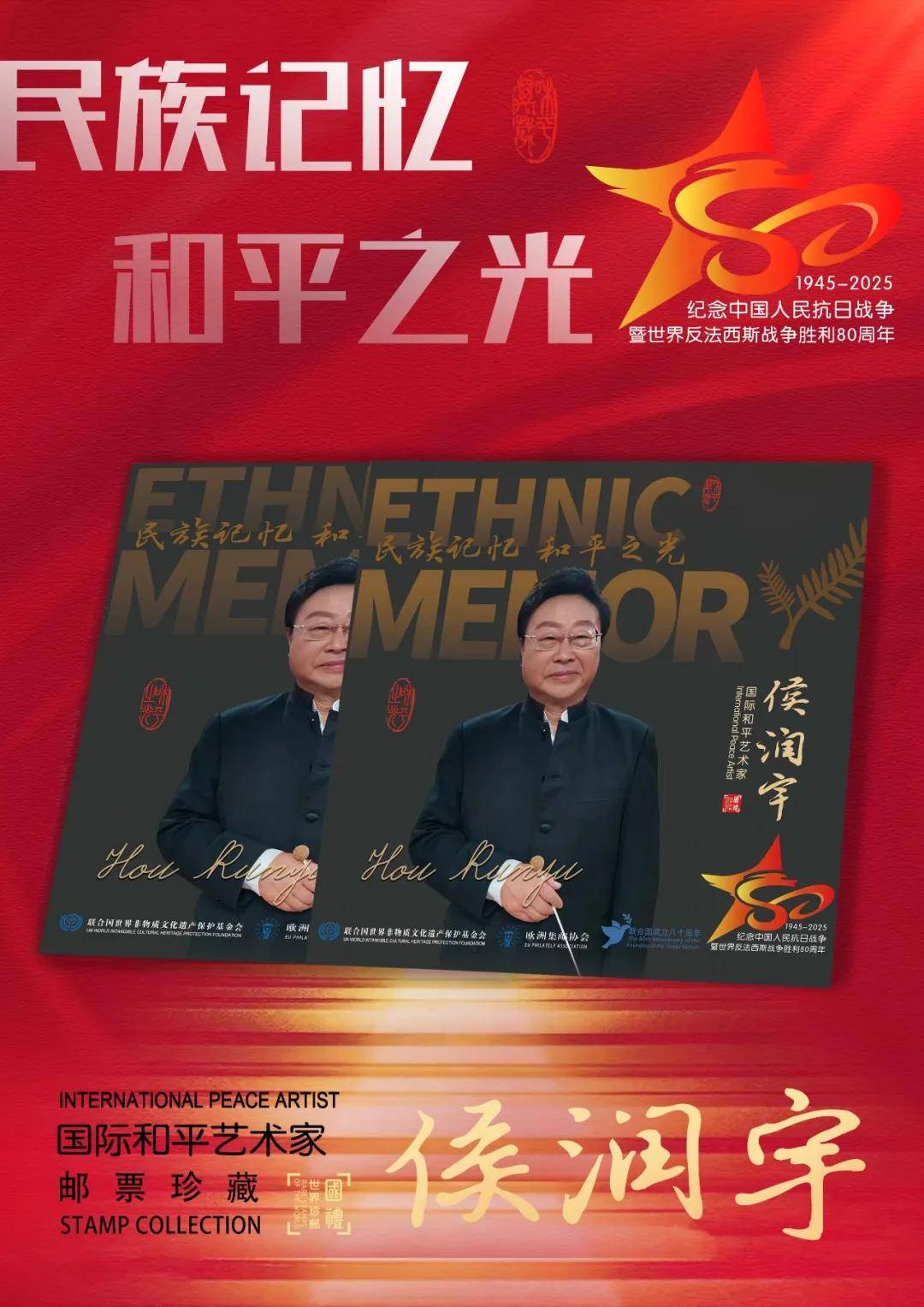 同时,联合国邮政、德国邮政、荷兰邮政、奥地利邮政为中国指挥名家侯润宇在全球公开发行一套以纪念中国人民抗日战争暨世界反法西斯战争胜利80周年“民族记忆 和平之光——国际和平艺术家”为主题的邮票与珍藏册。以邮为媒,方寸之间让世界各地的人们感受到爱与和平的力量,并为世界和平发展注入新能量。