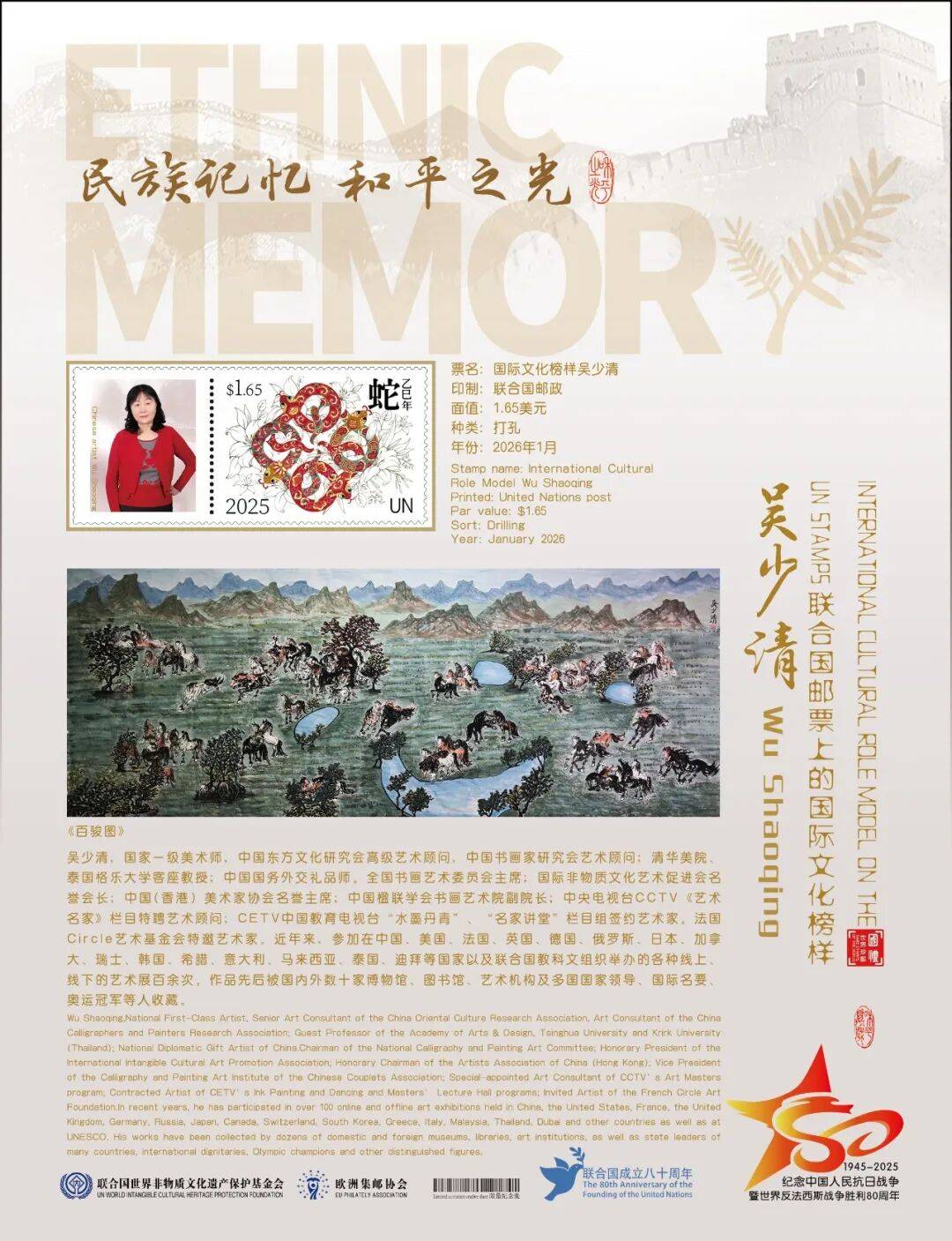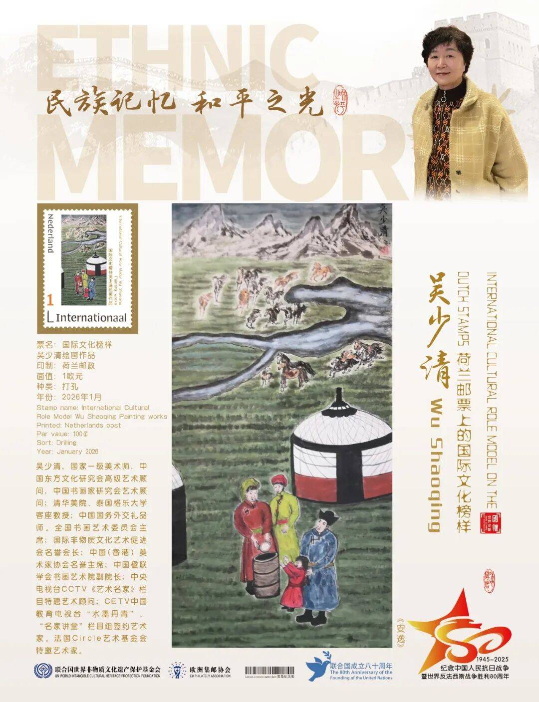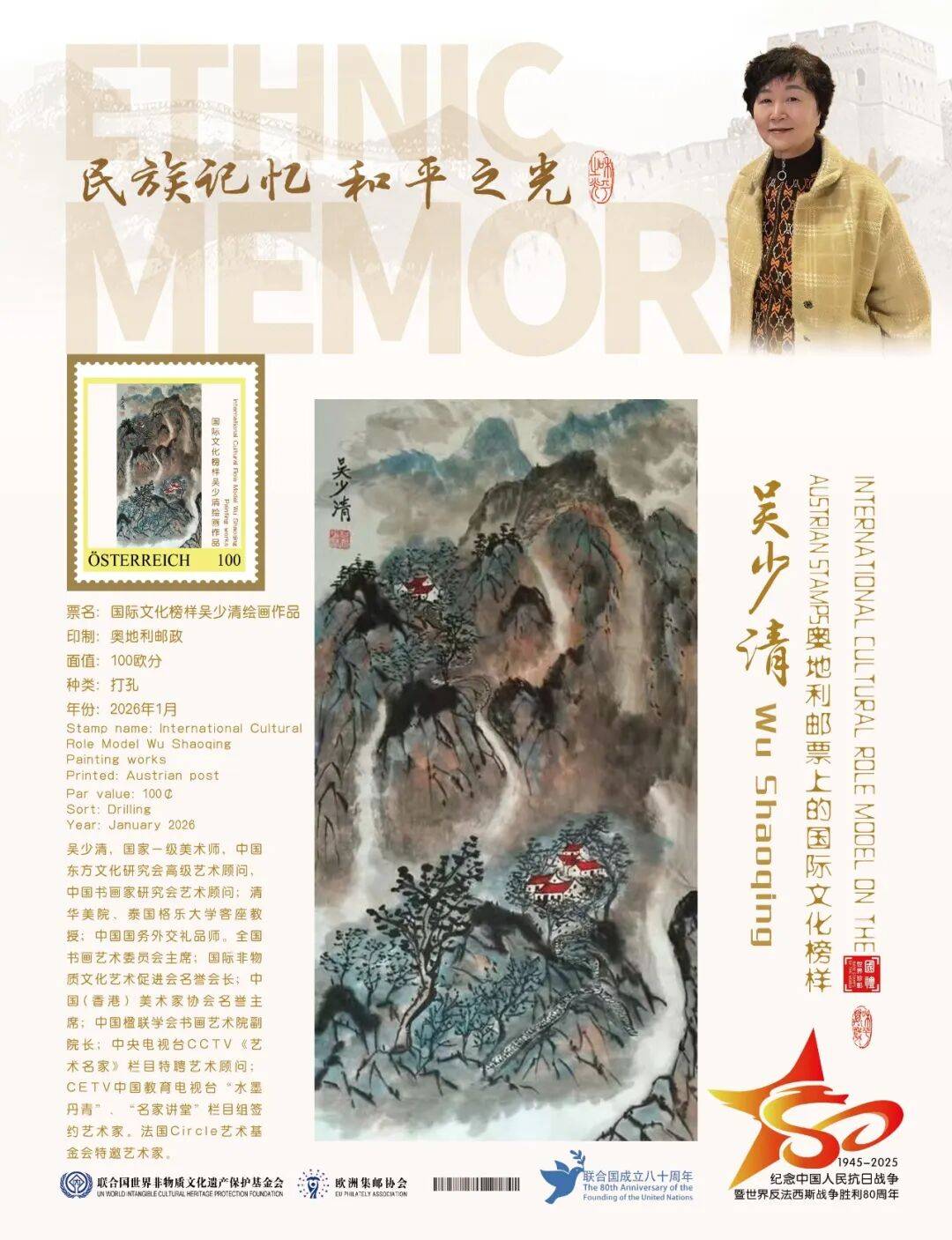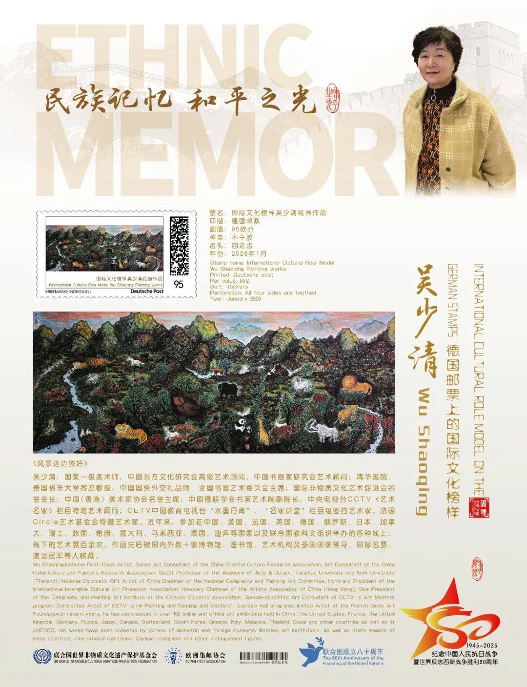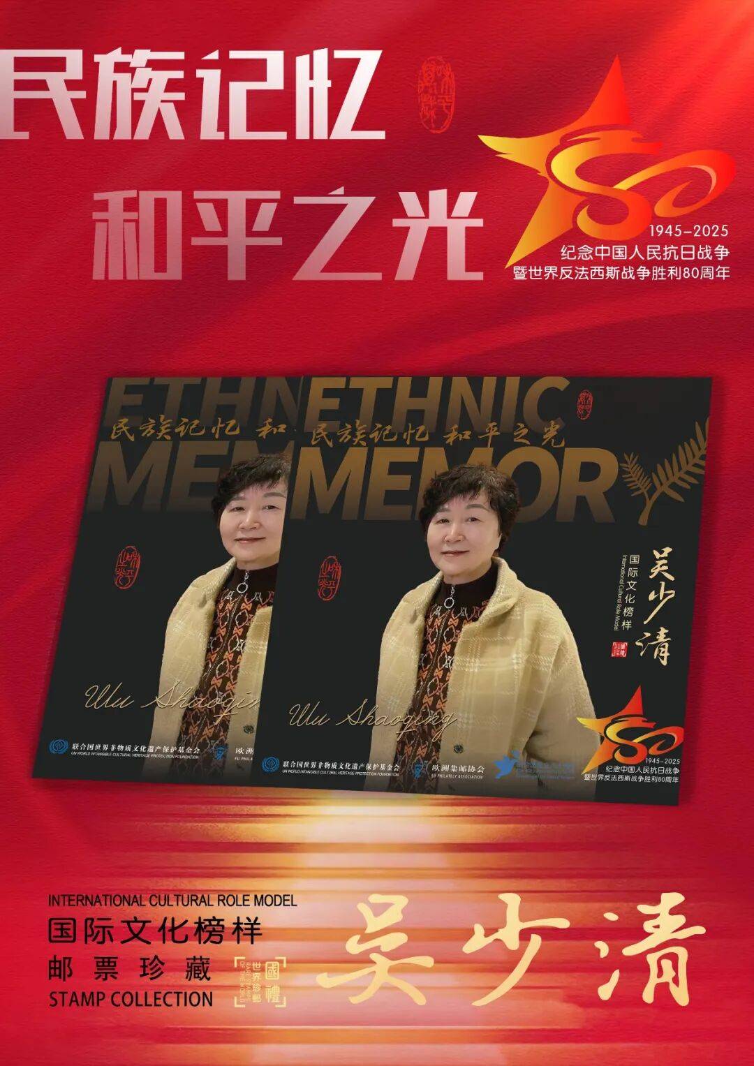 同时,联合国邮政、德国邮政、奥地利邮政、荷兰邮政为中国绘画名家吴少清在全球公开发行一套以纪念中国人民抗日战争暨世界反法西斯战争胜利80周年“民族记忆 和平之光——国际文化榜样”为主题的邮票与珍藏册。以邮为媒,方寸之间让世界各地的人们感受到爱与和平的力量,并为世界和平发展注入新能量。