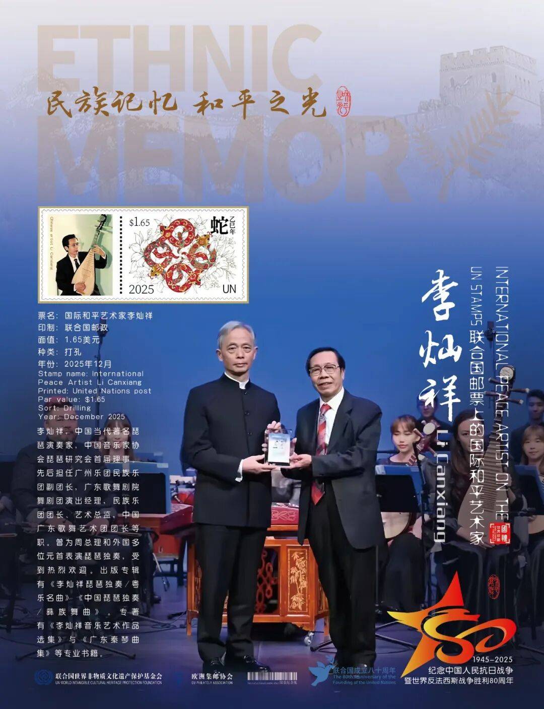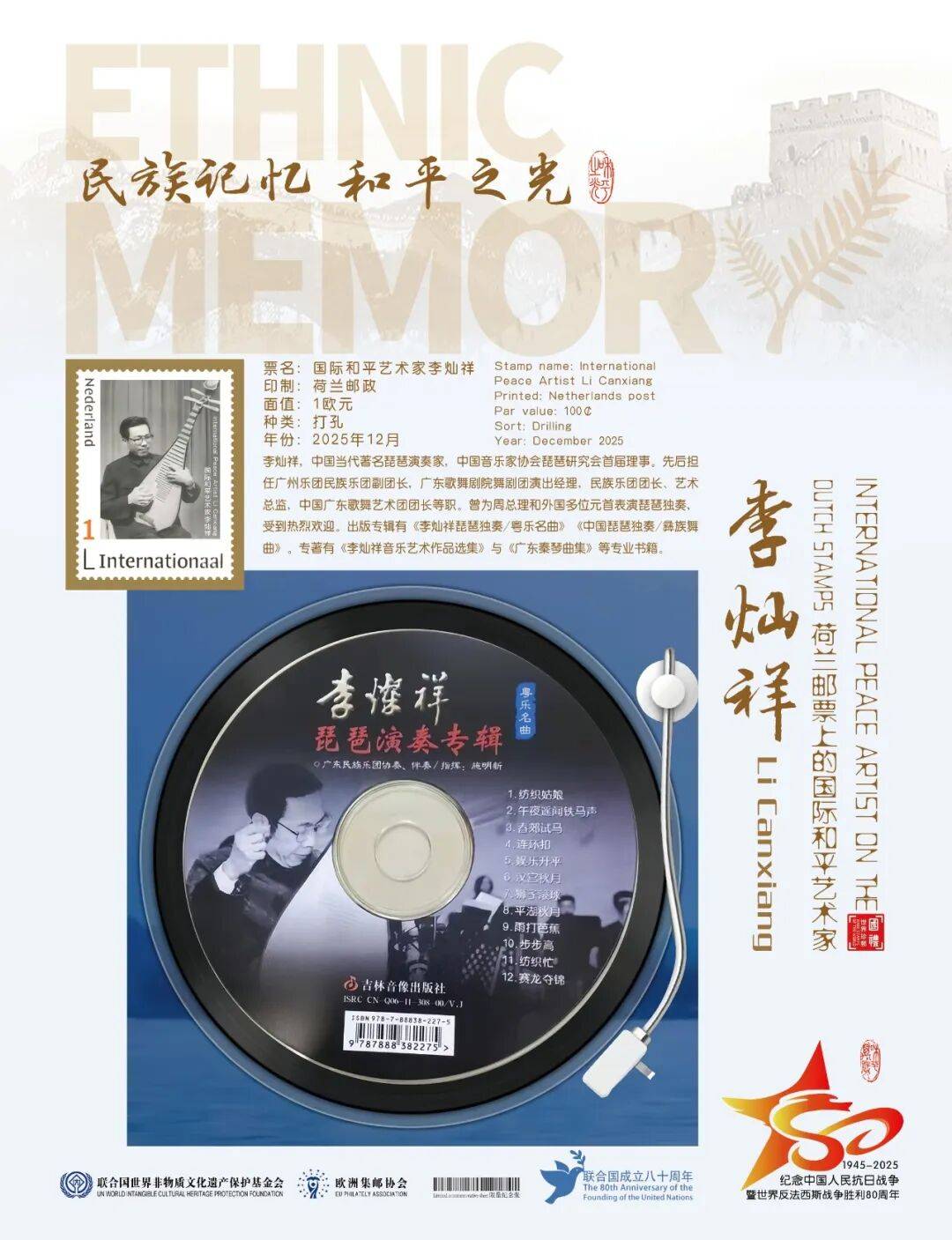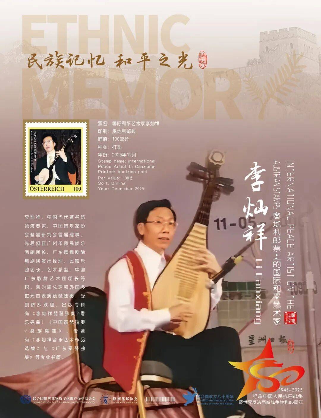 同时,联合国邮政、德国邮政、荷兰邮政、奥地利邮政为中国著名琵琶演奏家李灿祥在全球公开发行一套以纪念中国人民抗日战争暨世界反法西斯战争胜利80周年“民族记忆 和平之光——国际和平艺术家”为主题的邮票与珍藏册。以邮为媒,方寸之间让世界各地的人们感受到爱与和平的力量,并为世界和平发展注入新能量。